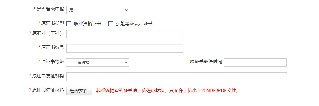 如果按照选择“是”,按照申报要求提供低一级别职业资格证书(或职业技能等级证书),在“原证书佐证材料”处上传证书扫描件。