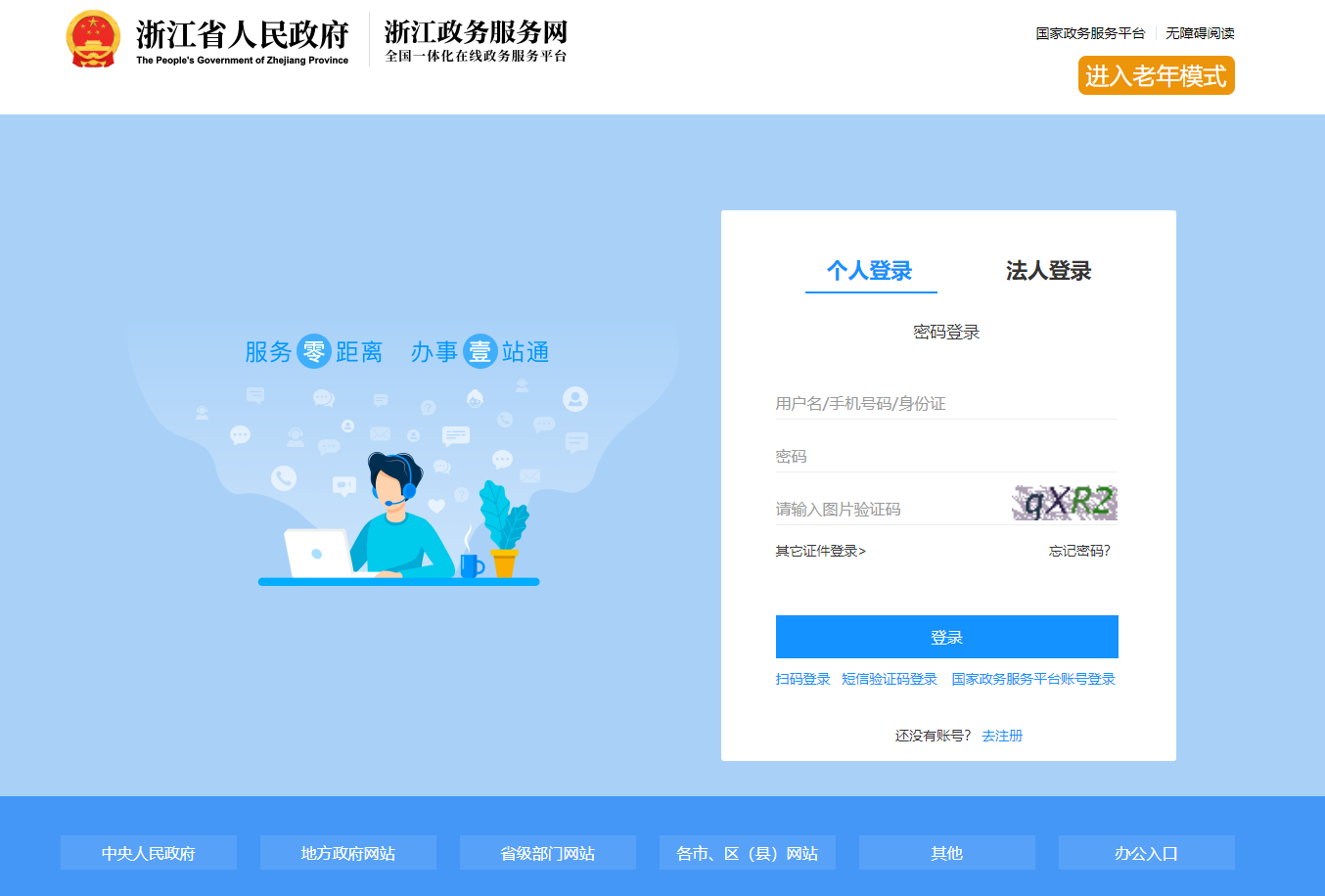 (三)选择【个人登录】,考生如果在浙江政务网已经注册过,可使用原来的账号信息登录,如果没有注册过,请按要求先注册成功后再申报