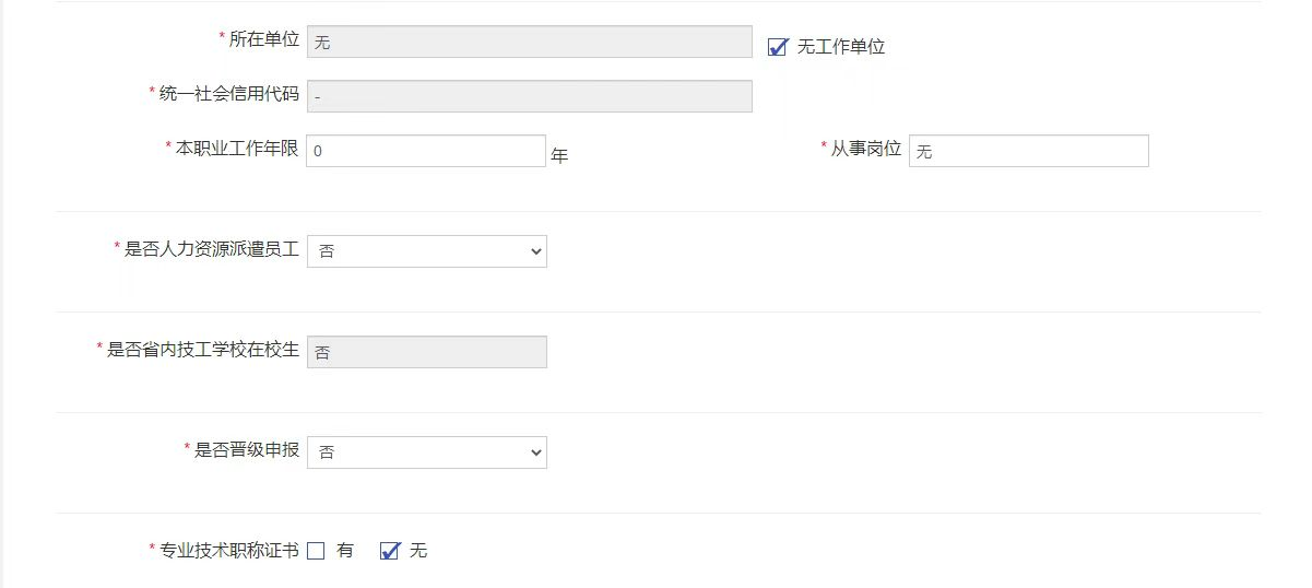 3.考生在填写个人报名信息时,考生来源分为社会人员和院校学生;在校大学生统一勾选为“院校学生”,所在单位均勾选“无工作单位”,“本职业工作年限”、“从事岗位”等均填“0”、“无”或“否”。