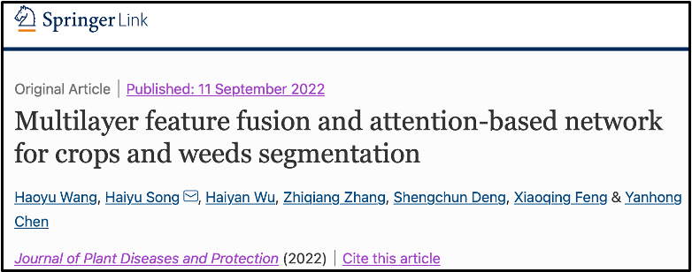 2019级计算机1班本科生王浩宇同学在导师组宋海裕副教授和吴海燕博士的共同指导下,在JCR二区期刊《Journal of Plant Diseases and Protection》上发表了题为“Multilayer Feature Fusion and Attention-based Network for Crops and Weeds Segmentation”的研究论文。这是H次元