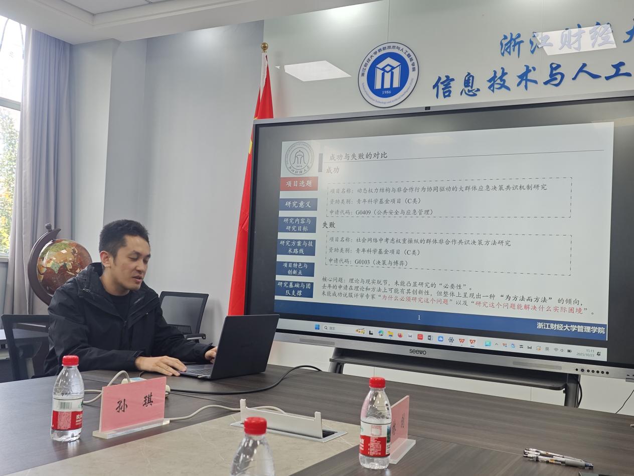 张翔博士结合自身申报多年的经历,分享了他的基金申报心路历程和心得感悟。他讲到,不管是基金申报还是青年教师的职业发展,都要走适合自己的道路,没有那条路是好走的,但只要坚持下去总会开花结果。张翔老师的分享为参会教师提供了深刻启示。