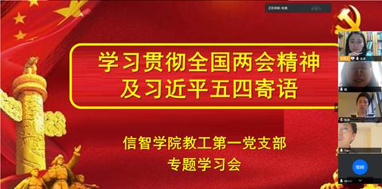 教工第一党支部召开“学习贯彻全国两会精神及五四寄语”专题会议。会议由支部书记朱凌主持,学院党委副书记田聪、支部委员章华、刘维树、及在国内外的支部党员老师们共同与会学习。