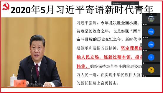 同时,支部党员回顾了十八大以来习近平总书记的青春寄语,特别学习了2020年5月习近平总书记在五四青年节时对新时代青年人的寄语。
