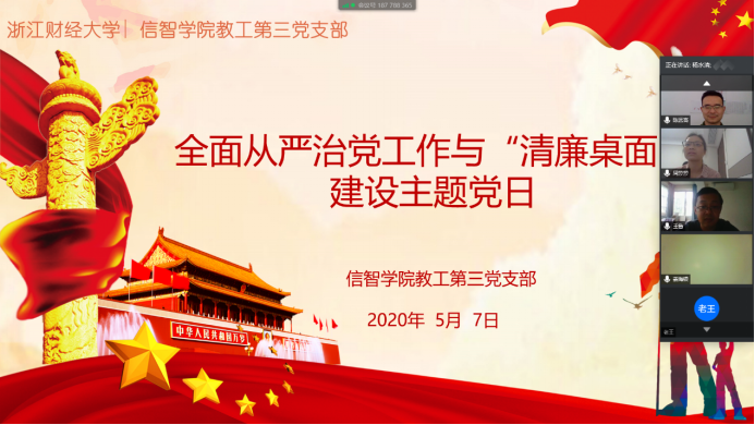 为深入贯彻执行中共中央办公厅印发的关于《党委(党组)落实全面从严治党主体责任规定》,落实学校全面从严治党工作暨“清廉校园”建设推进会的会议精神。202057日,信息管理与人工智能学院教工第三党支部在线开展全面从严治党与“清廉桌面建设”专题组织生活会,会议由支部书记杨水清主持,支部成员参加会议。