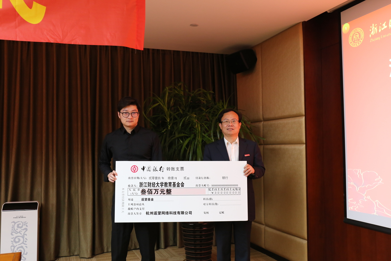 信息管理与工程学院举办“遥望基金”捐赠签约仪式。出席本次签约仪式的有杭州遥望网络科技有限公司董事长兼CEO谢如栋校友,校友总会会长、校党委书记李金昌,校友总会副会长兼秘书长、党委副书记黄建新,党校办副主任郑纪达,校友总会办公室主任马亦群,计划财务处处长童玉玲,教务处副处长石向荣,信工学院院长张文宇等,签约仪式由信工学院党委副书记陆颋浩主持。