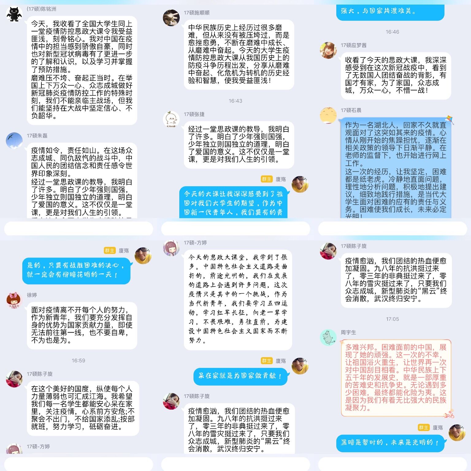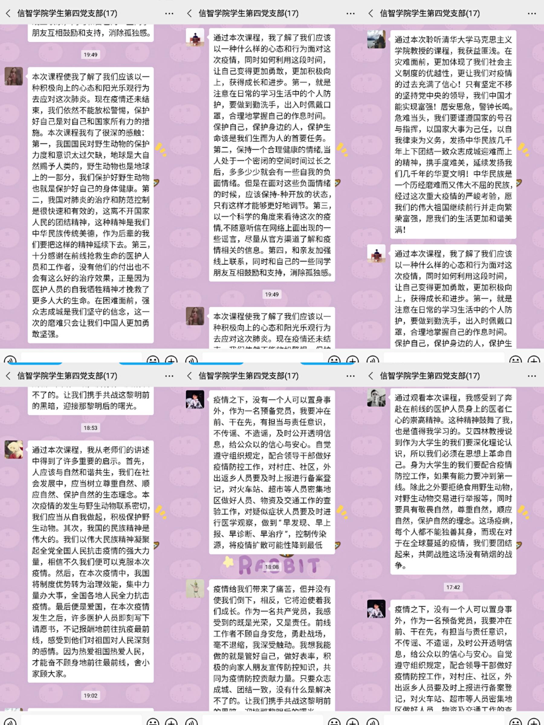 学生第三党支部书记毛立晨:此次抗疫大考中,有千千万万的逆行者们不畏传染,战胜恐惧,奔赴前线,他们在战场上表现出来的青春力量和大无畏精神是值得每位大学生学习和思考。青年们应当明确自己的责任与担当,坚持与全国人民同呼吸,共命运!坚决打好这场防控防疫阻击战,为人民为国家贡献自己的力量。