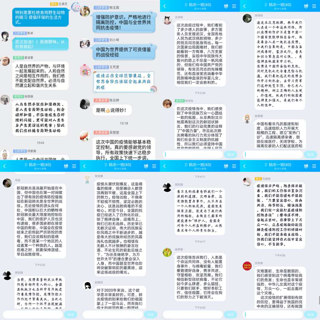 学生第一党支部书记吕挺:在全球一体化的今天,任何国家都无法从一次突发的疫情或灾难中脱离自身。这次疫情,不仅是中国受到伤害,而作为重量级国家,目前来看全球都因为疫情受到严重影响。而我也从来都相信,中国一定会战胜疫情,继续保持一个负责任的大国形象,为全人类的进步做出自己的贡献。
