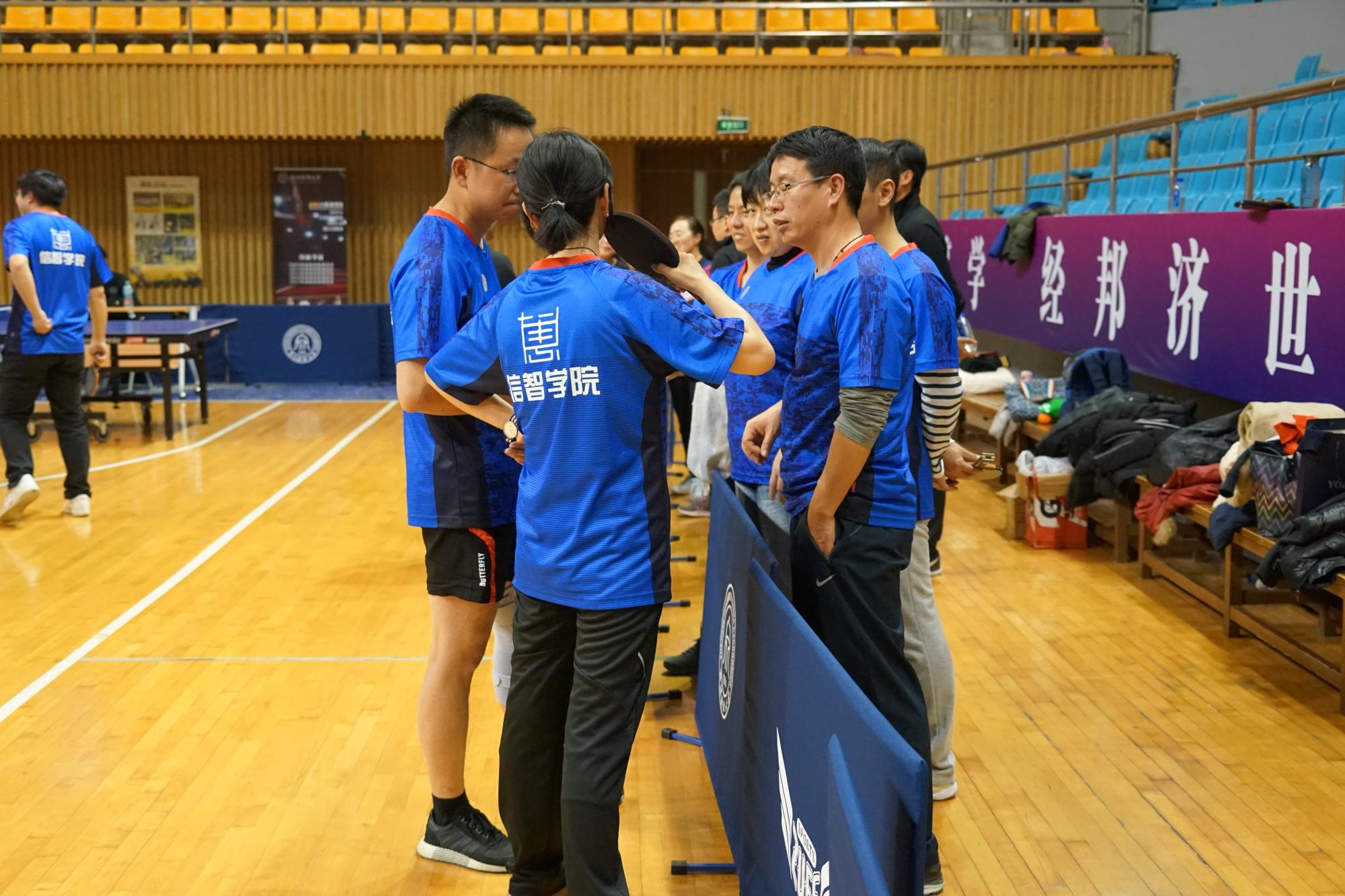 赛前分工组积极动员教师参加比赛,在亮丽的队服上印上学院的LOGO和名称,期望能成为赛场上一道风景。正式比赛日队员早早到场,积极热身投入战斗。教练与队员们细致考量队手、机智排兵布队,赛场上队员们挥洒汗水,使出千般绝技发球抢攻、正手提拉、反手推挡,关键时刻队员们团结合作,大家众志成城,关注场上每局比赛,每一分的争夺,呼喊加油,鼓劲助威!终于我们创造历史,夺得季军!