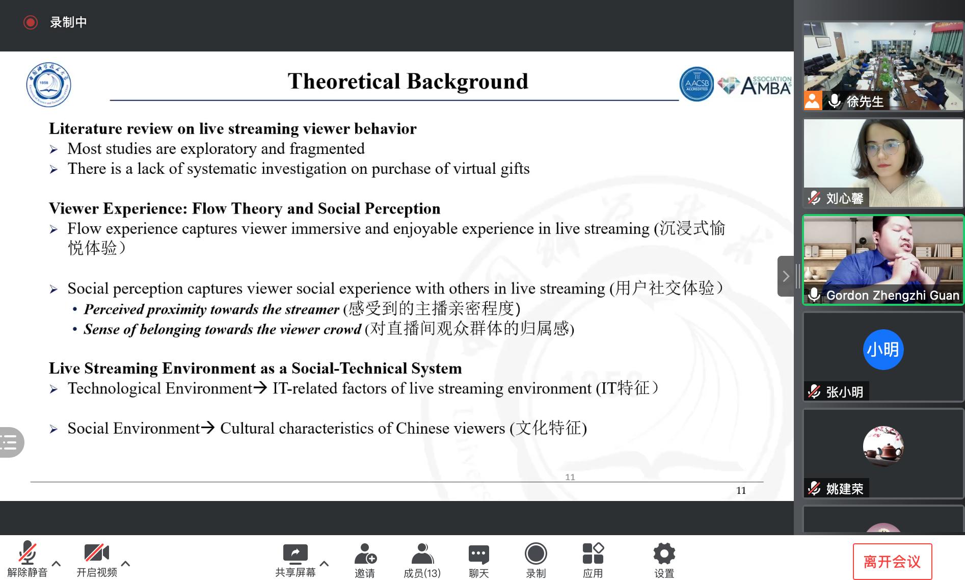 第三届国际青年学者论坛如期举行。学院召开分论坛-智能技术与智慧管理前沿。因疫情防控要求,此次以“云论坛”形式举办,共11名来自诺丁汉大学、香港理工大学、中国科学院大学、同济大学、哈尔滨工业大学、上海财经大学等全球知名大学的青年学者与会。院长张帅教授、书记徐奇伟副教授、副院长陈远高教授、院长助理隆清琦博士以及各学科带头人、系部办主任、支部书记和学院研究生代表参加了此次论坛。