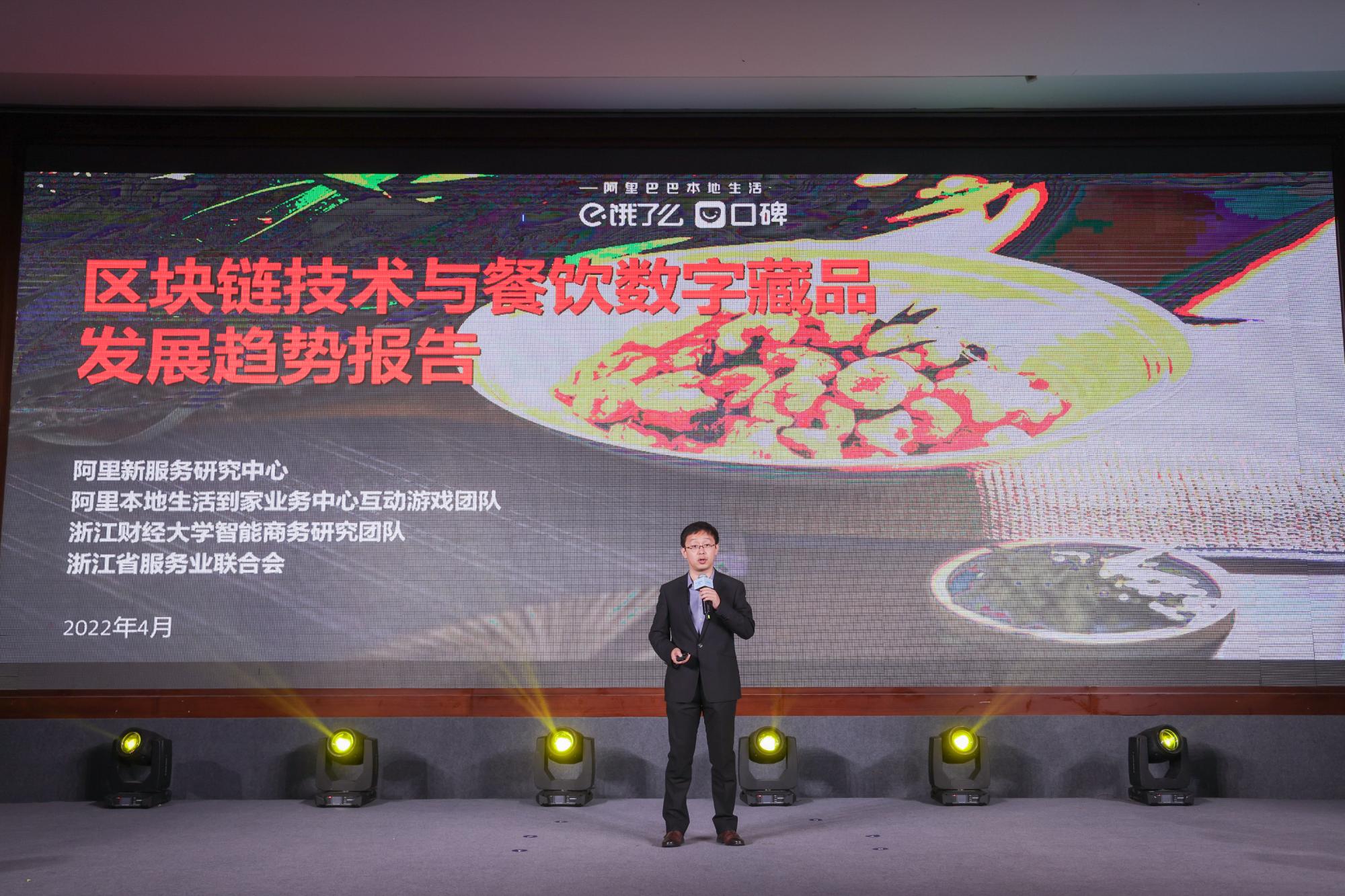 在本次发布会上,阿里新服务研究中心携手阿里本地生活到家业务中心互动游戏团队、H次元 智能商务研究团队、浙江省服务业联合会共同发布《区块链技术与餐饮数字藏品发展趋势报告》,并由H次元 电子商务系王鲁博士在发布会上做主题报告。