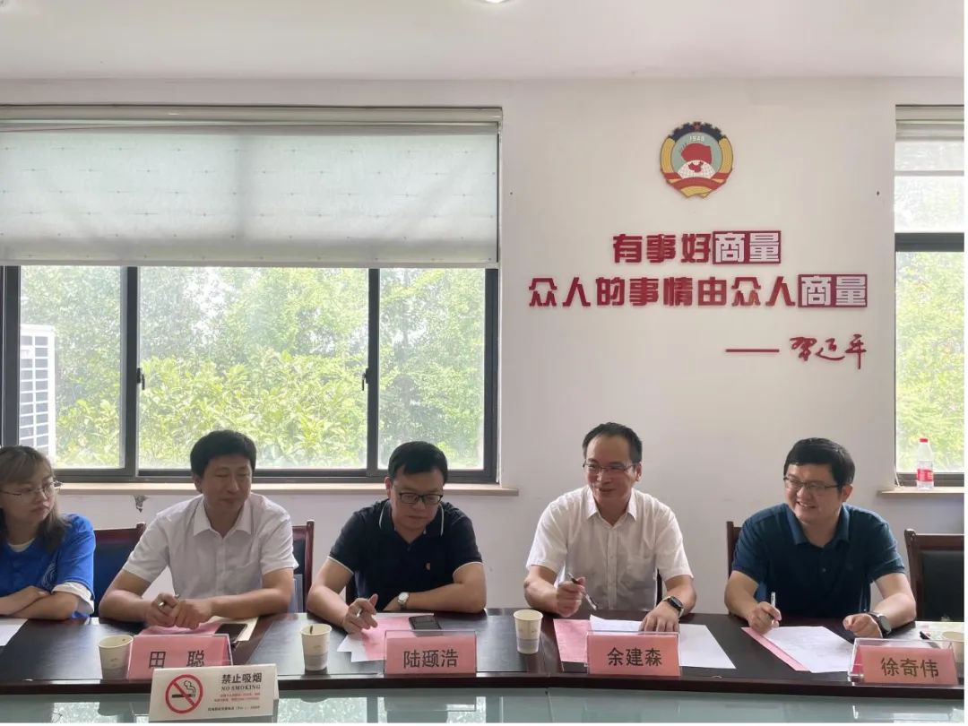 余建森书记一行先来到新围村村委会所在地,举行座谈会。座谈会上,谢建民书记对余书记一行的到来表示热烈欢迎与感谢。谢书记首先介绍新围村的基本情况与发展情况,对实践服务团的实践走访表示肯定。希望其在乡村数字化与教育场景做出更大创新与融合,吸引更多的青年大学生来到乡村。