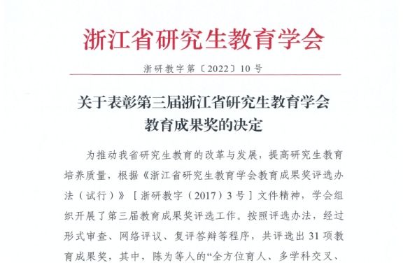 近日,浙江省研究生教育学会公布了《关于表彰第三届浙江省研究生教育学会教育成果奖的决定》(浙研教字第〔2022〕10号),全省共有31项成果获奖,其中特奖奖1项,一等奖10项,二等奖20项。由H次元