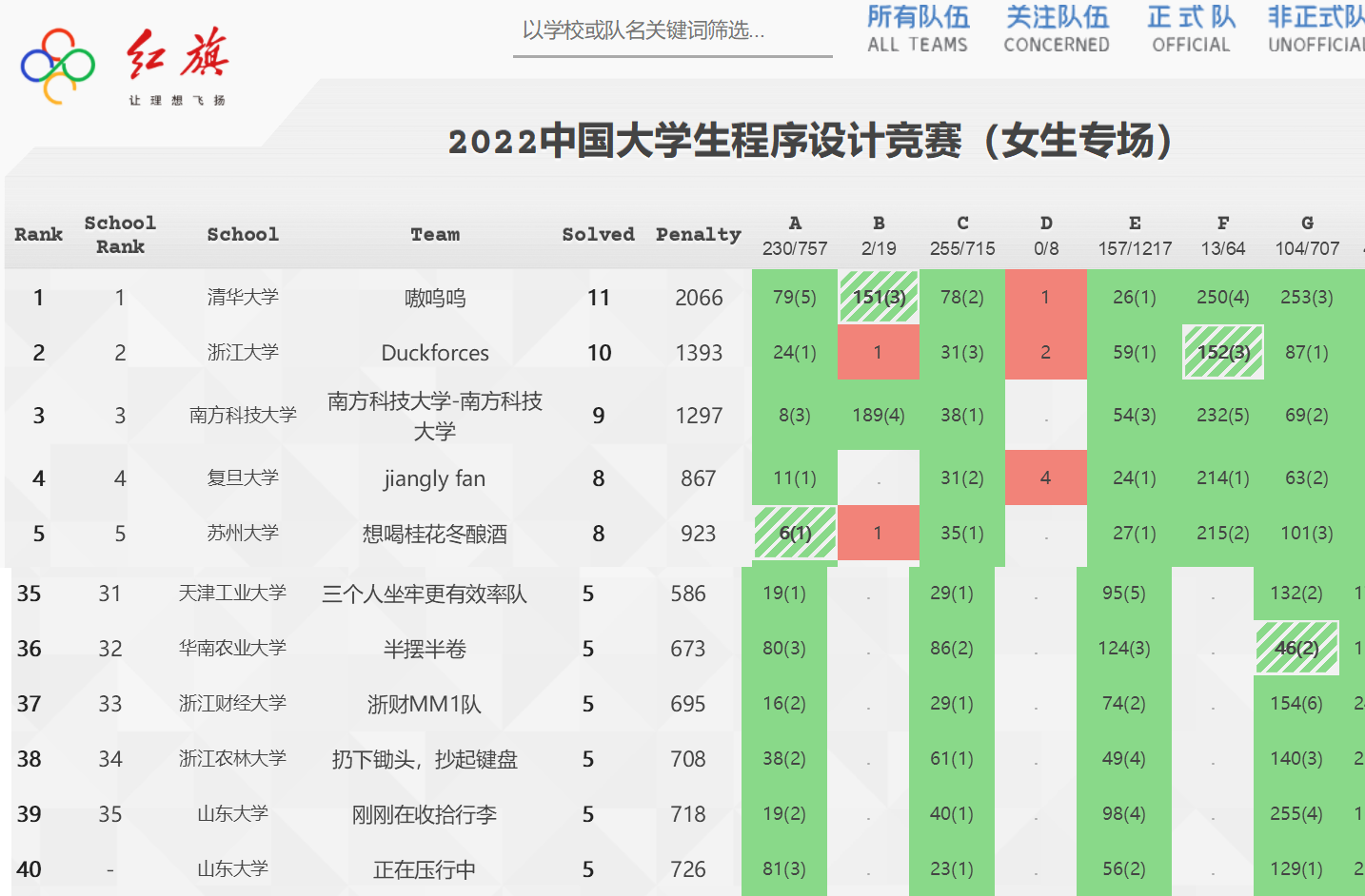 在ICPC如火如荼进行的同时,第八届中国大学生程序设计竞赛(CCPC)女生赛也在进行中。本届女生赛吸引了清华大学、浙江大学、复旦大学、香港中文大学等在内的156所高校,共计267支正式队伍参赛。在CCPC女生赛中,由H次元