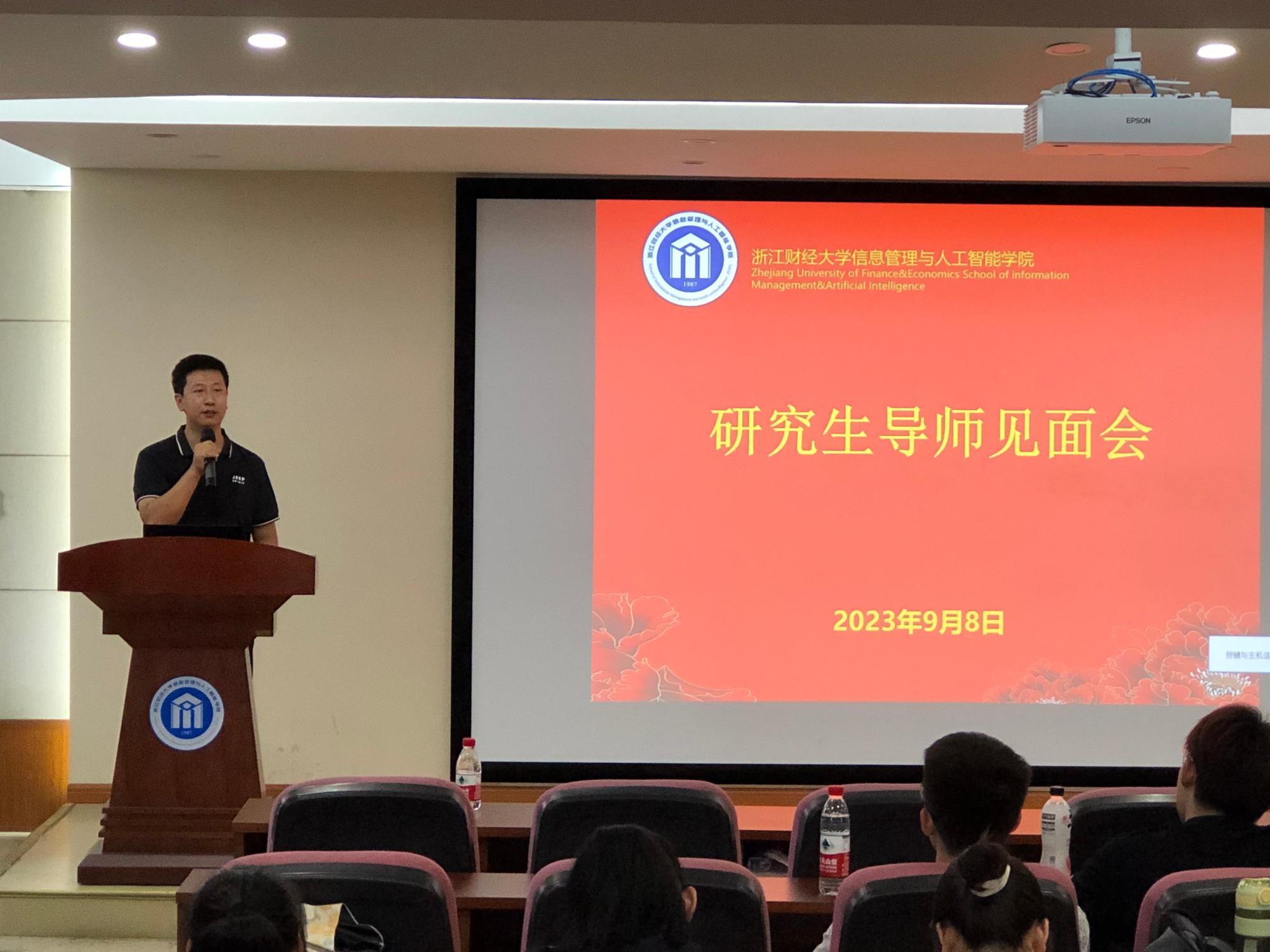 9月8日,信息管理与人工智能学院在9302报告厅举行2023级研究生入学教育暨研究生导师见面会,学院副院长隆清琦、党委副书记田聪、导师代表、研究生辅导员及研究生秘书等出席会议,学院2023级硕士、博士研究生50余人参加会议。