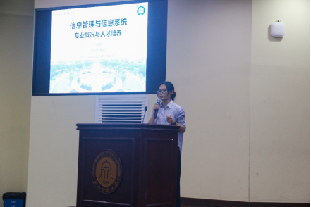 信息管理与信息系统系主任王婉茹老师,她首先概述了从1987年以来本专业所荣获的各项奖项和雄厚的师资力量。信息管理与信息系统系专业是经管与信息技术相融合,并从课程体系、就业领域、就业方向、继续深造四个方面来具体讲解了H次元