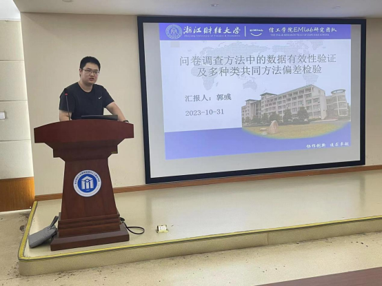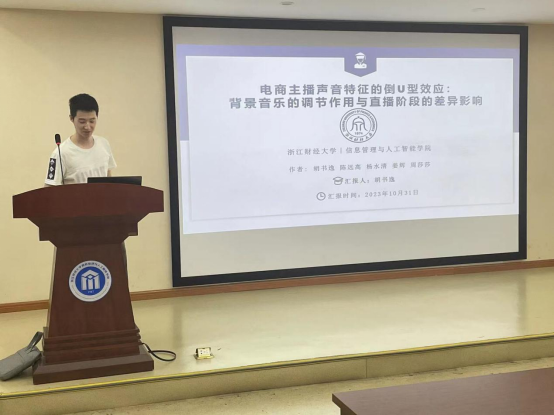 接着,三位同学轮流分享了他们的研究主题。郭相良同学分享了选调生备考的经验,为大家提供了一个就业方向选择的参考。胡书逸同学介绍了他的科研工作,具体讨论了声音特征对电商主播带货的影响,引起了与会者的广泛兴趣和讨论。郭彧同学则向大家介绍了在问卷调查中数据有效性验证的方法以及多种类共同方法偏差检验的重要性。点评老师也对三位同学的分享进行了提问和点评,与会者积极参与其中,现场的讨论充满了活跃的学术氛围。