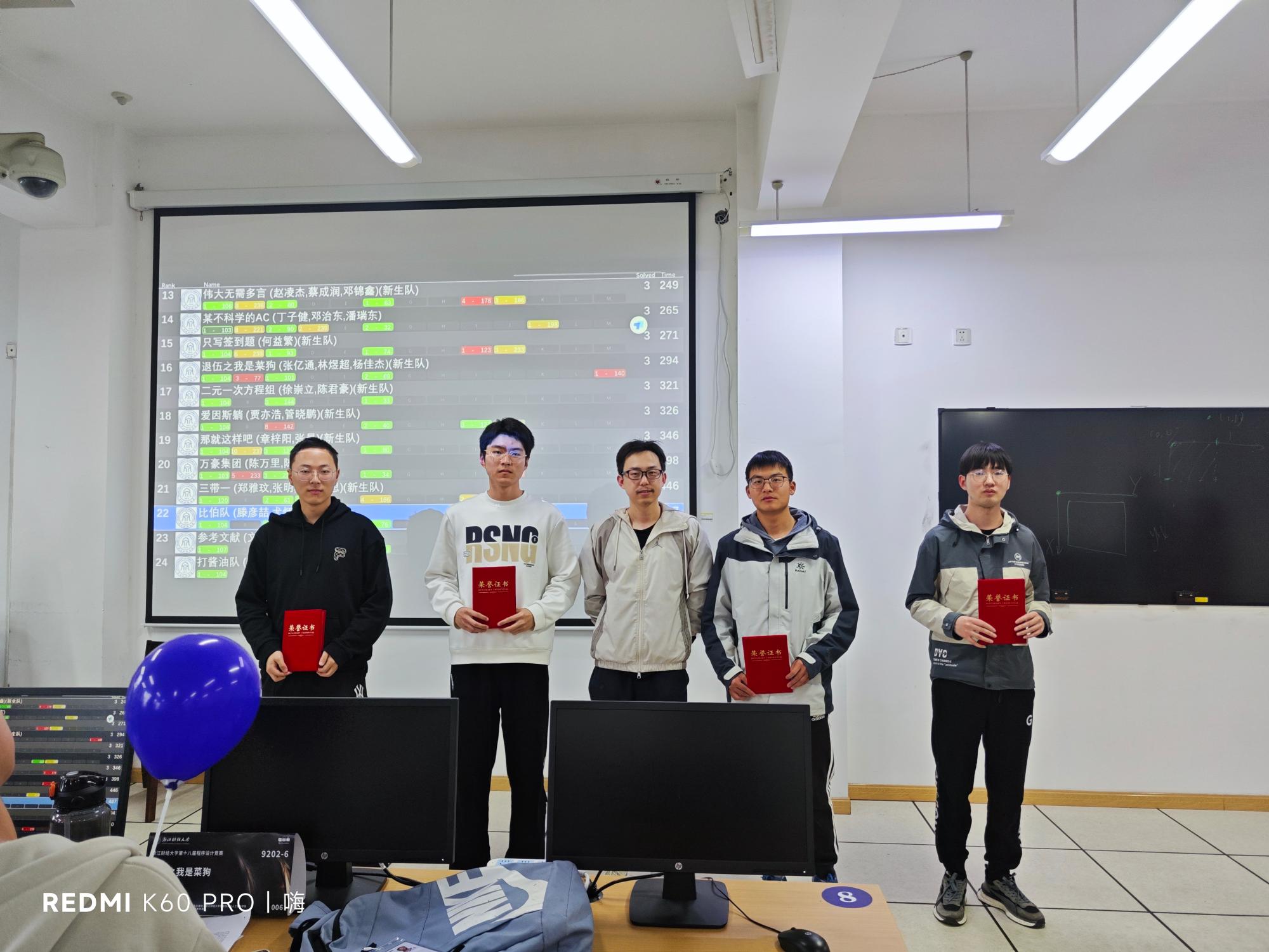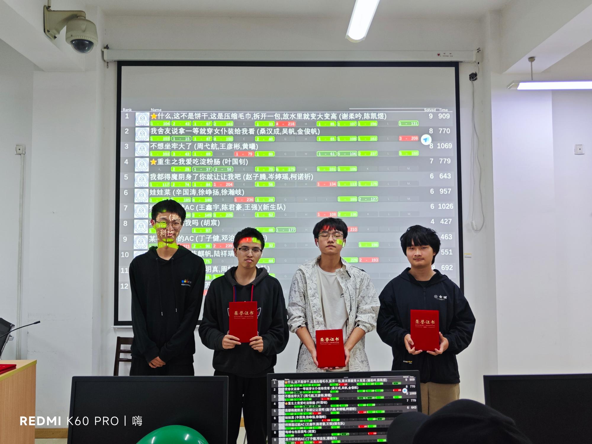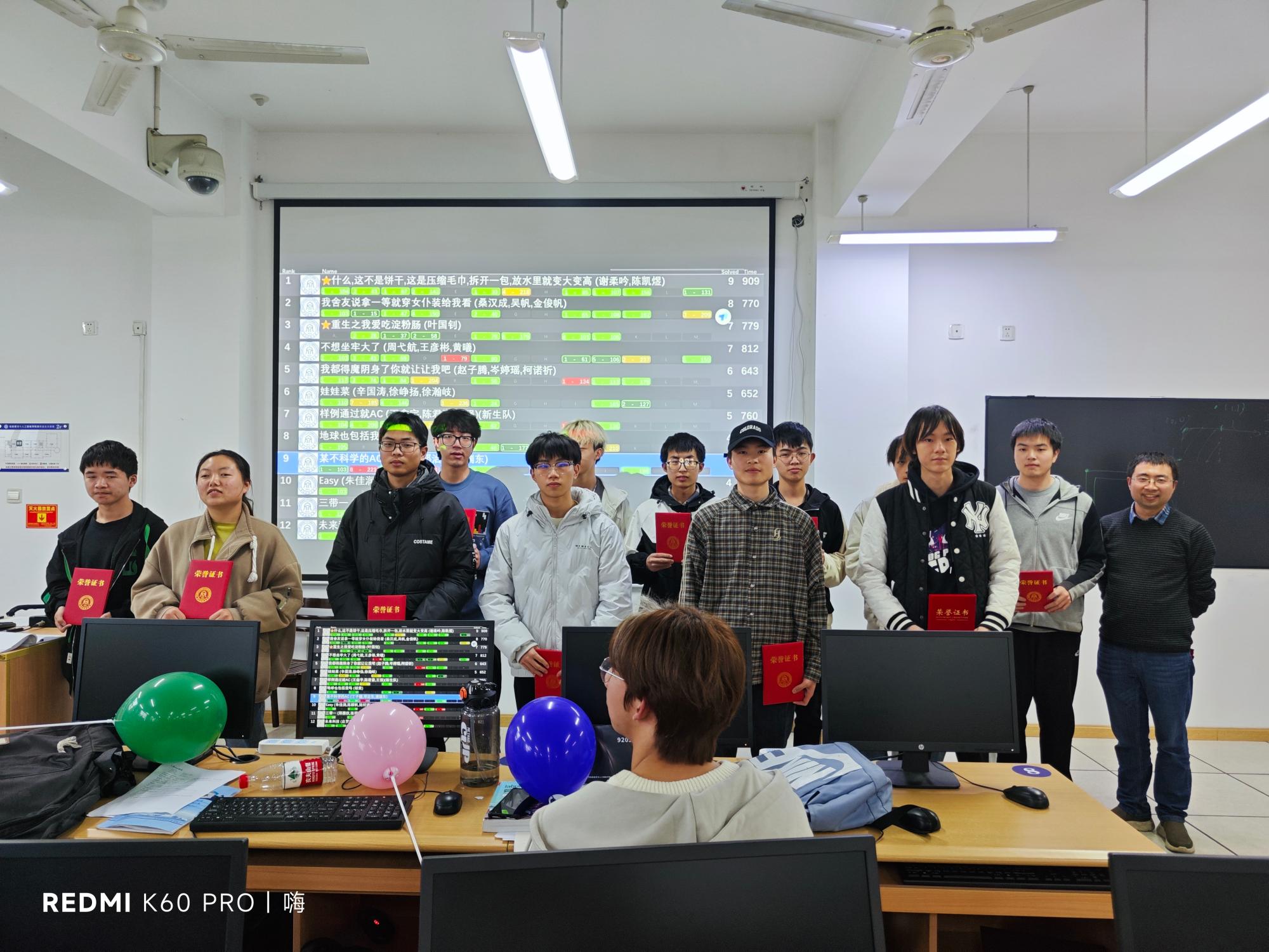 四个小时的答题时间转瞬即逝,本次比赛于下午17:30准时结束。闭幕式上,经过紧张激动的滚榜环节,获奖名单随之而出。本次比赛获奖人员共94人,其中三等奖47人,二等奖28人,一等奖19人,同时评出“最佳新生队”和“顽强拼搏奖”,并由副院长朱凌以及陈琰宏、杨泽等老师、张垚垚、冯裕钵等命题组成员为获奖同学颁奖。