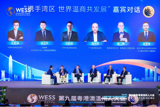 人工智能研究院院长张文宇,温州市青年企业家协会会长苏孝锋,香港香港温州工商会会长陈瑛,广州温州商会会长金中芳,深圳市温州商会会长沙胜昔就“如何推动新质生产力与社会经济高质量发展”等话题展开讨论。