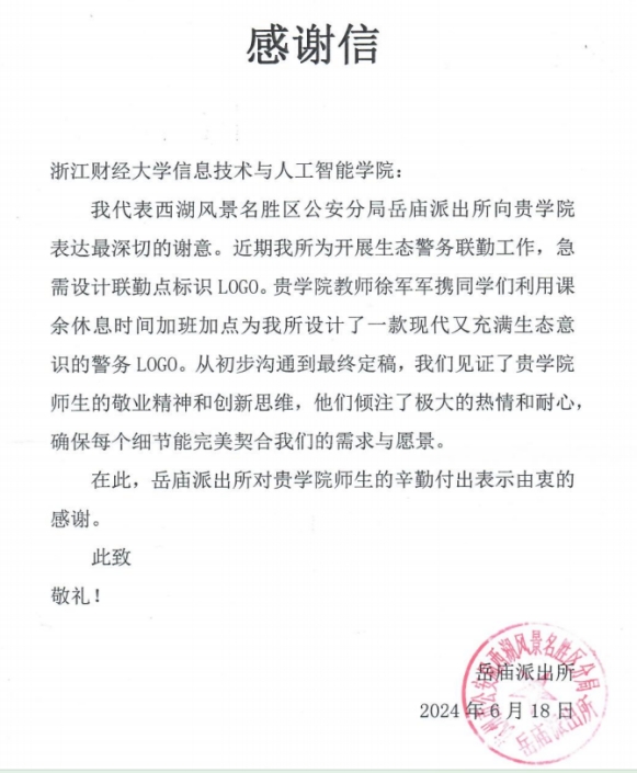 收到西湖风景名胜区公安分局岳庙派出所发来的一封感谢信。来信对H次元