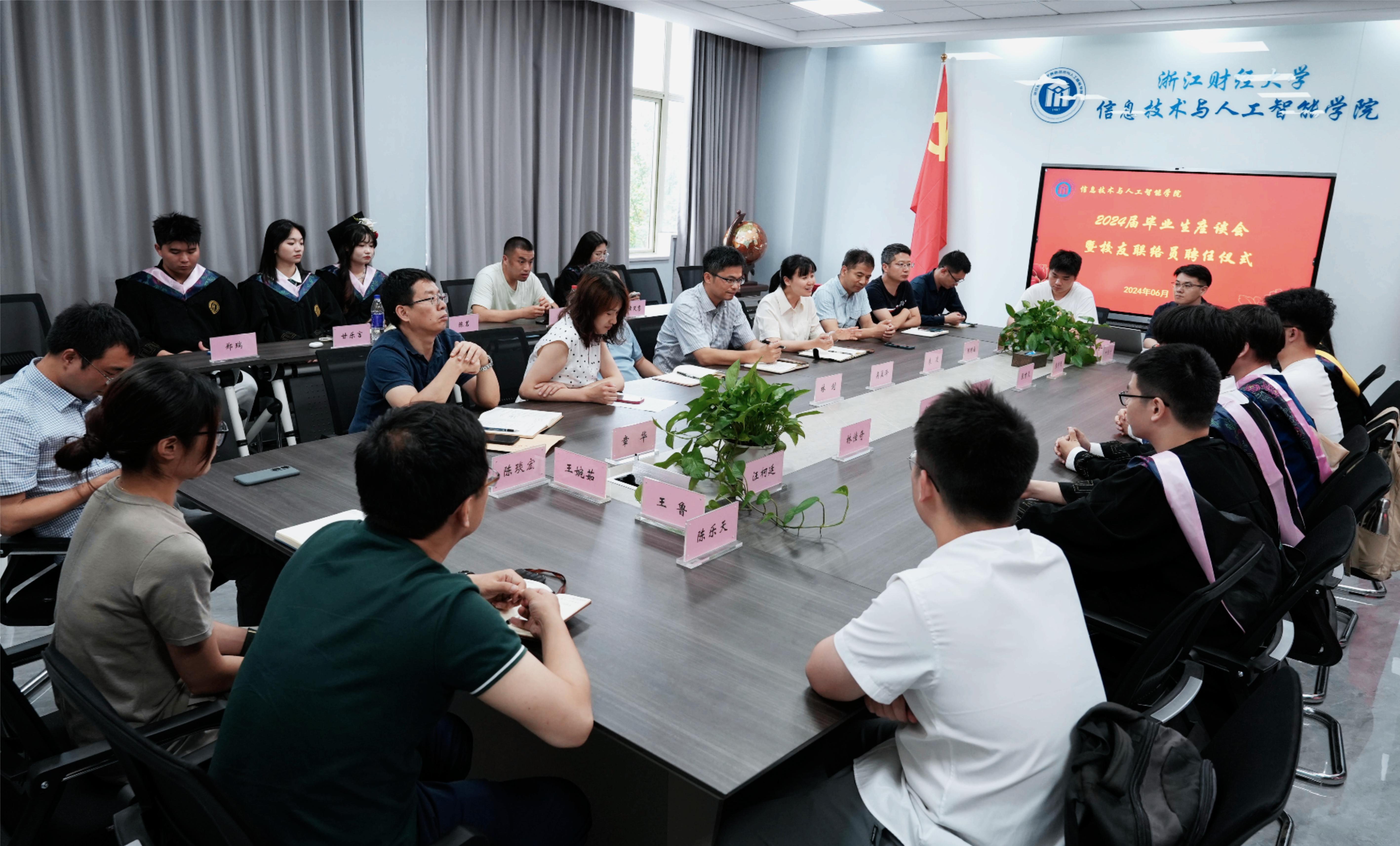 2024届毕业生座谈会暨校友联络员聘任仪式在9号楼404会议室召开,学院党委书记吴翼泽,副院长林剑、朱凌,党委副书记吴轶韵,院长助理陈明晶,实验中心主任、社会培训中心主任章华,院办主任徐吉锋,学办主任洪宝华,各系部主任及教师代表,毕业生辅导员出席本次座谈会。2024届校友联络员、学生干部代表等参加本次座谈会。会议由吴轶韵老师主持。