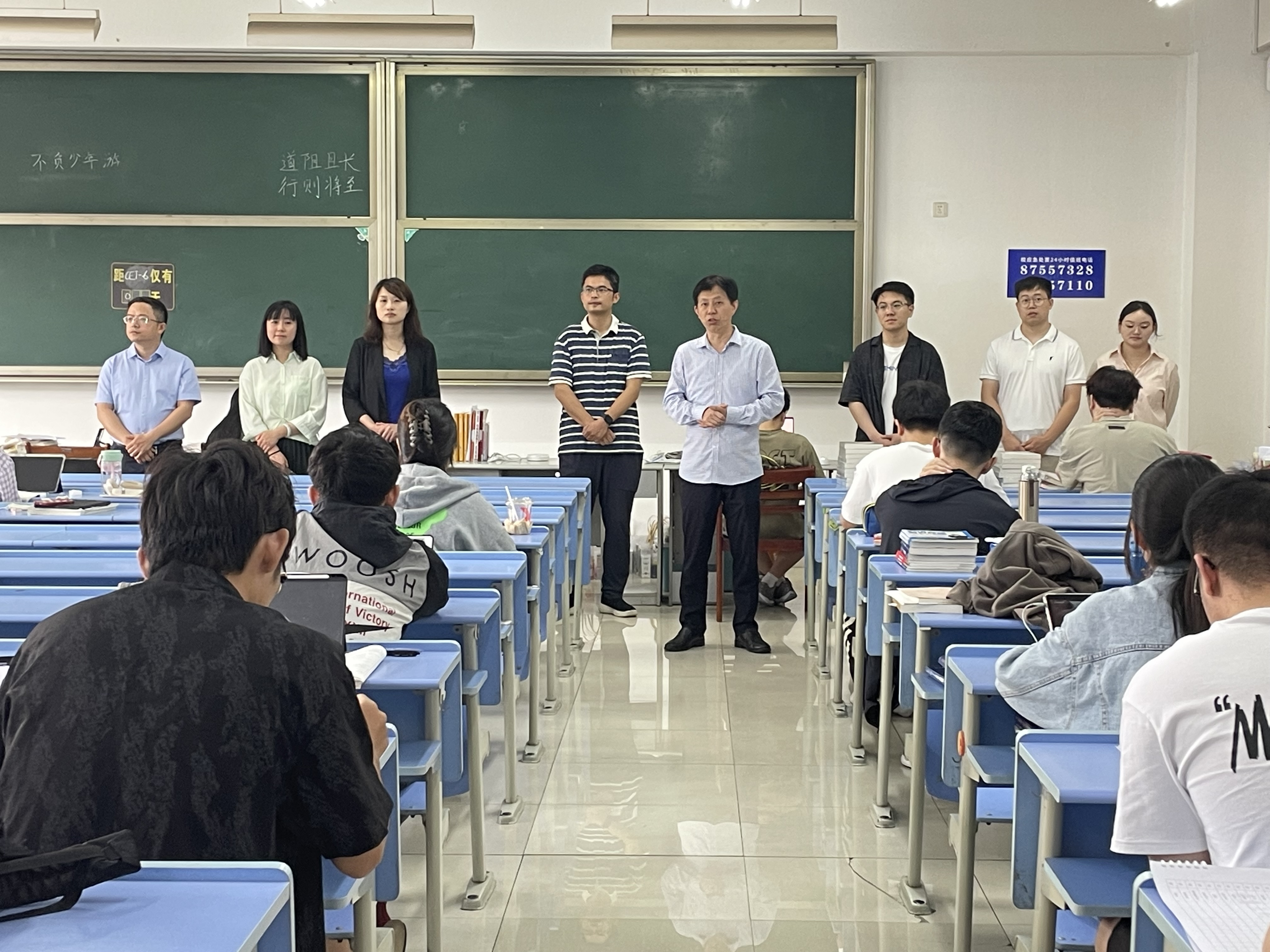 2025届学生坚定考研信念、保持学习热情、舒缓备考压力,6月28日上午,学院院长张帅、党委书记吴翼泽、副院长林剑、朱凌、党委副书记吴轶韵及辅导员深入考研教室,为正在紧张备考的2025届学生送上关怀与祝福。