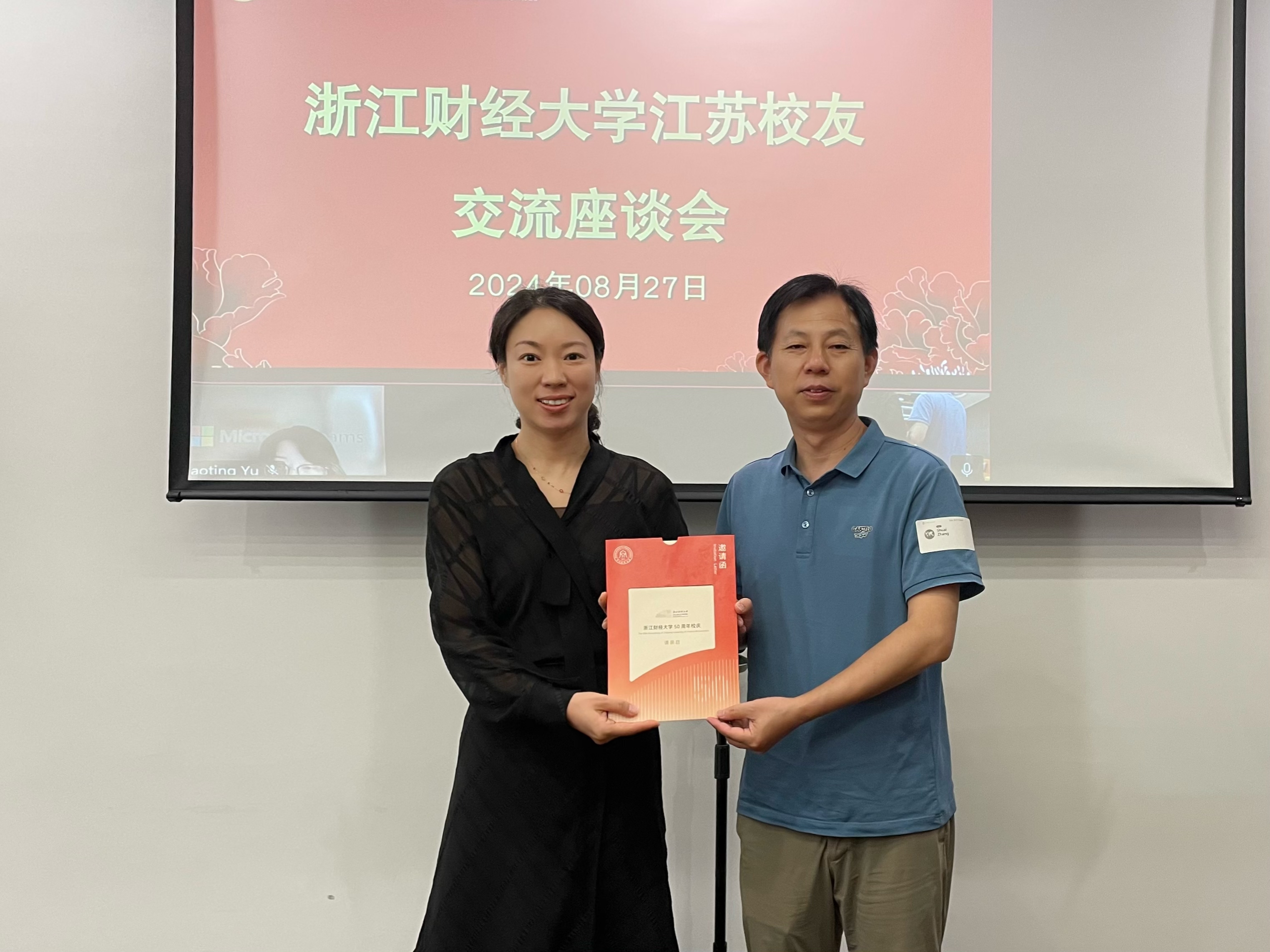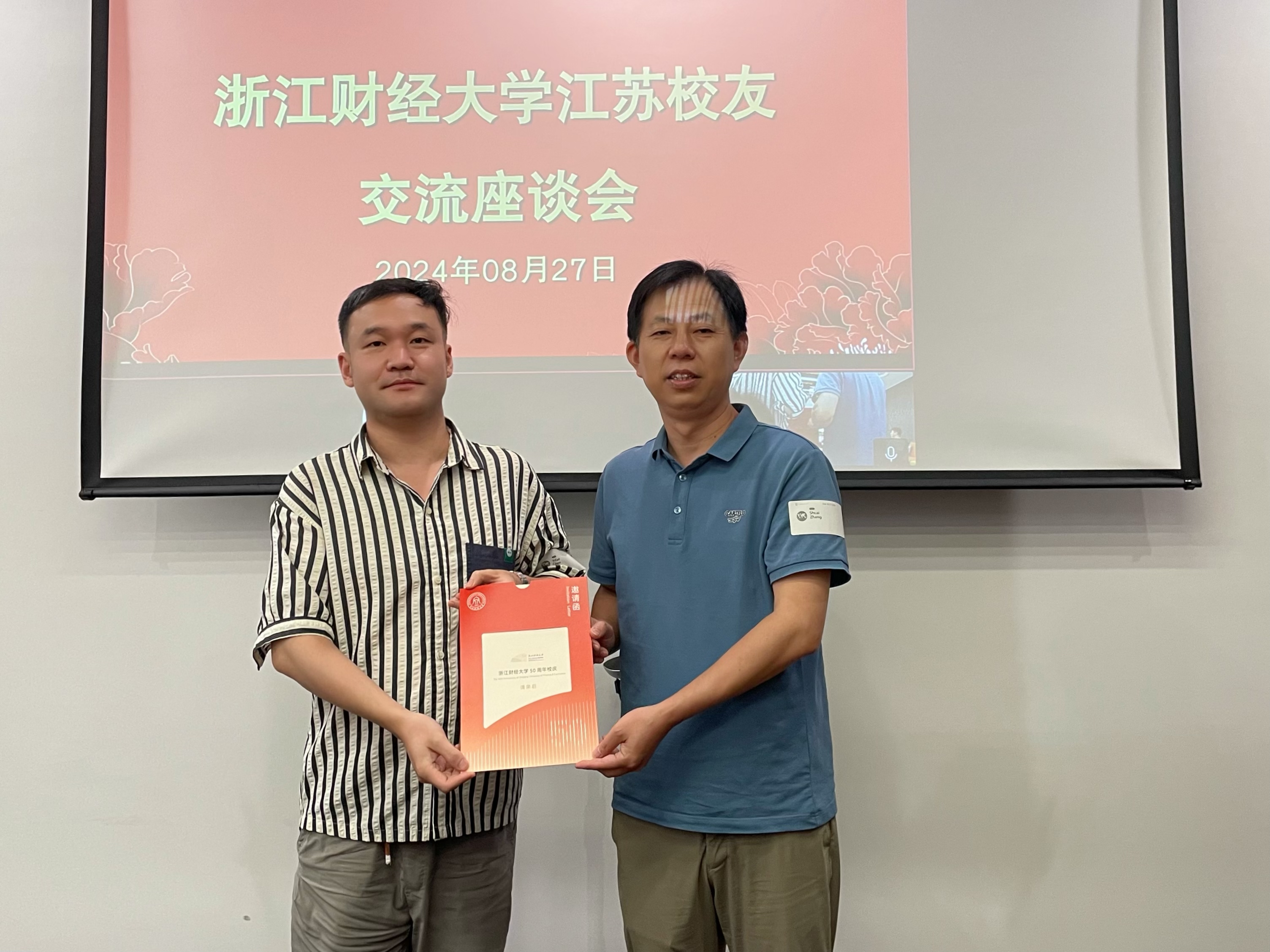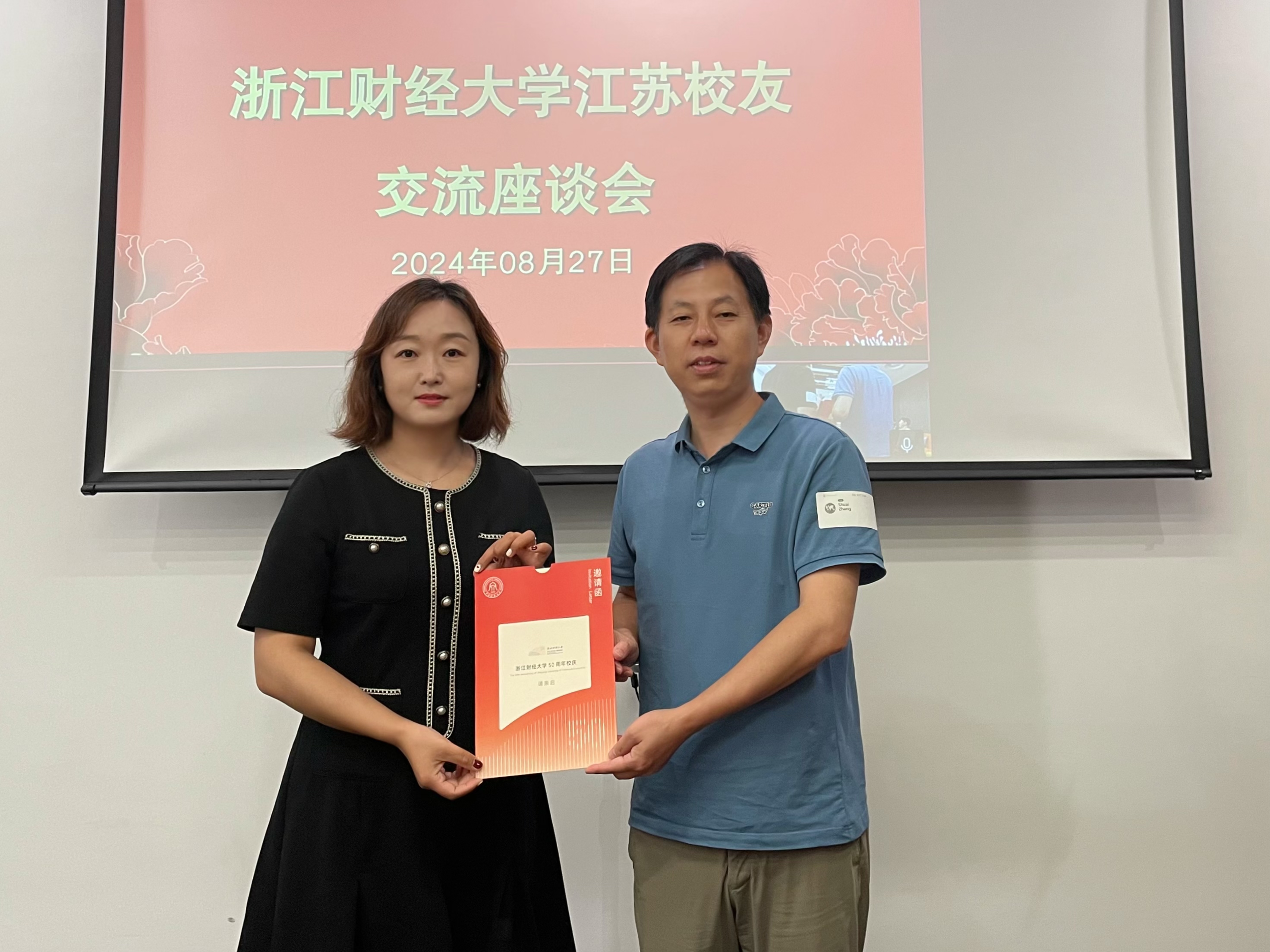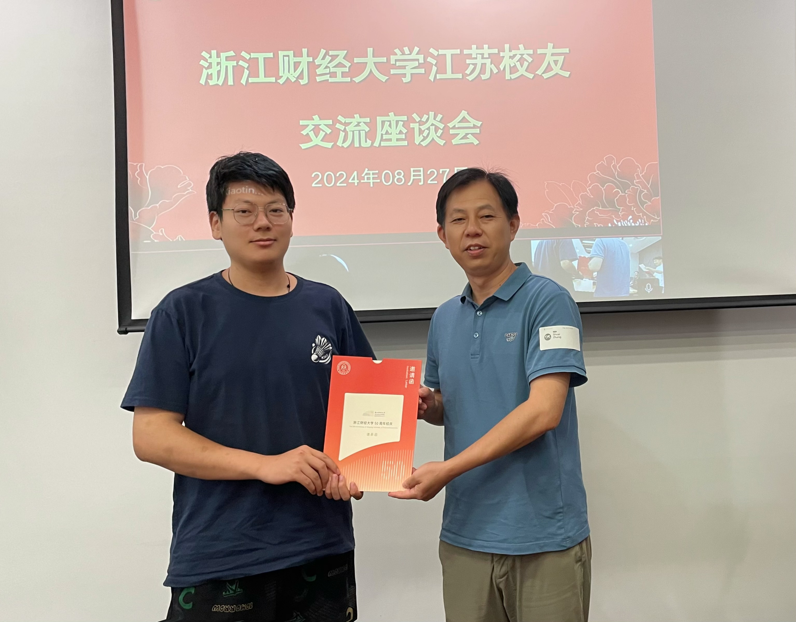 张帅为各校友颁发了50周年校庆邀请函,邀请校友回母校参与50周年校庆。