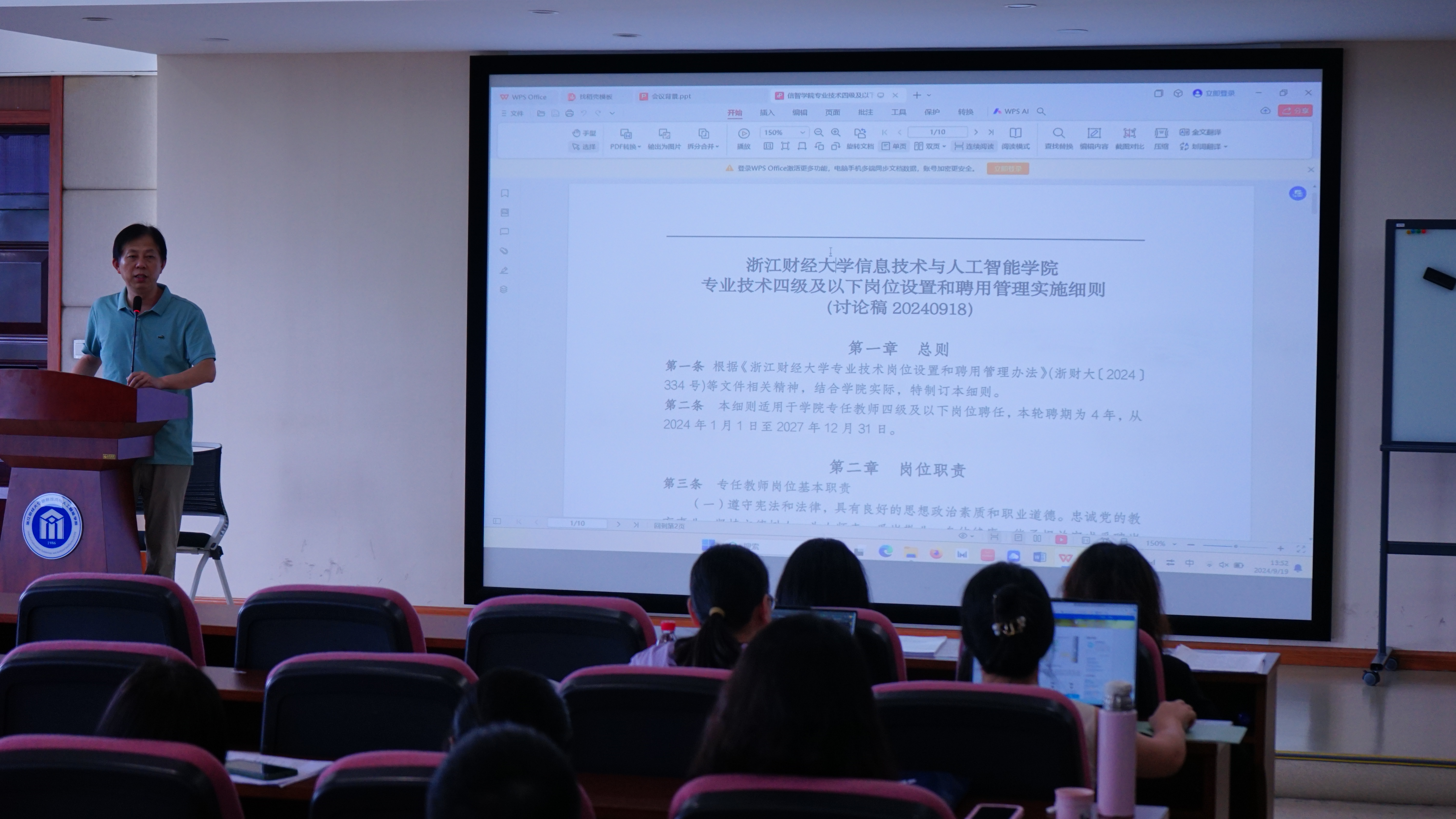专业技术岗位设置与聘用管理办法》浙财大【2024】334号文件精神,同时解读学院专业技术四级及以下岗位设置与聘任办法讨论稿。他指出各系部、各教师应充分认识岗聘工作的重要性,仔细对照相关办法,结合自身特点,选择岗聘类型,并对完善学院聘任办法提出建设性意见和建议。