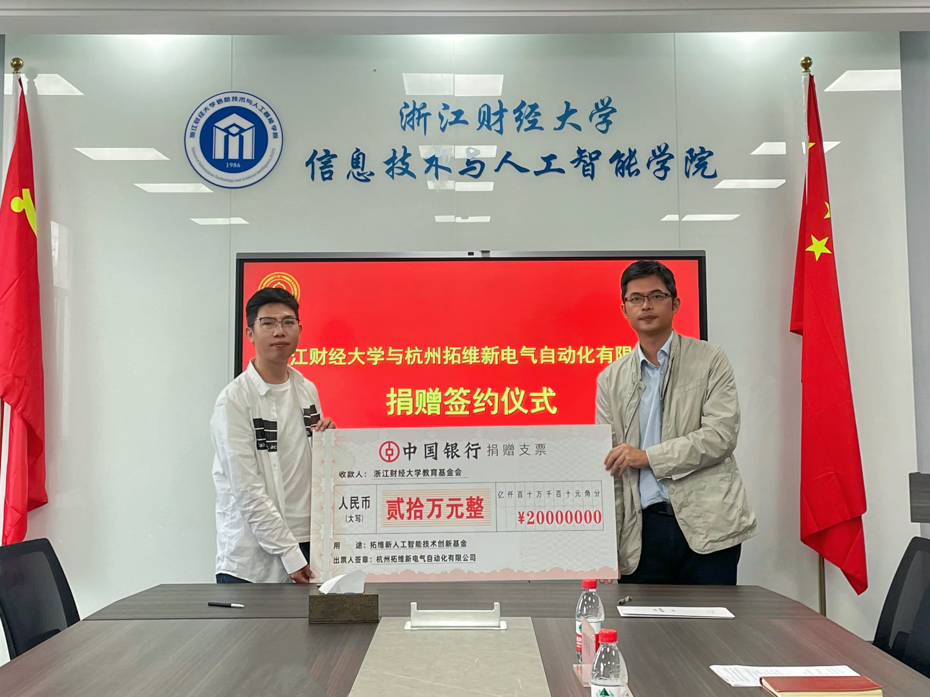 与杭州拓维新电气自动化有限公司举行捐赠签约仪式。杭州拓维新电气自动化有限公司合伙人、学院计算机系教师张翔、副总经理罗春香,校友办副主任韦晓蓓、学院院长张帅、党委书记吴翼泽、党委副书记吴轶韵等出席活动。