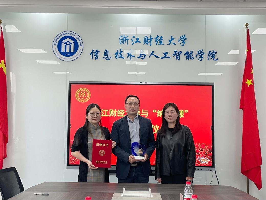 申屠莉为陈三春、毛菁华颁发捐赠证书和捐赠奖杯。
