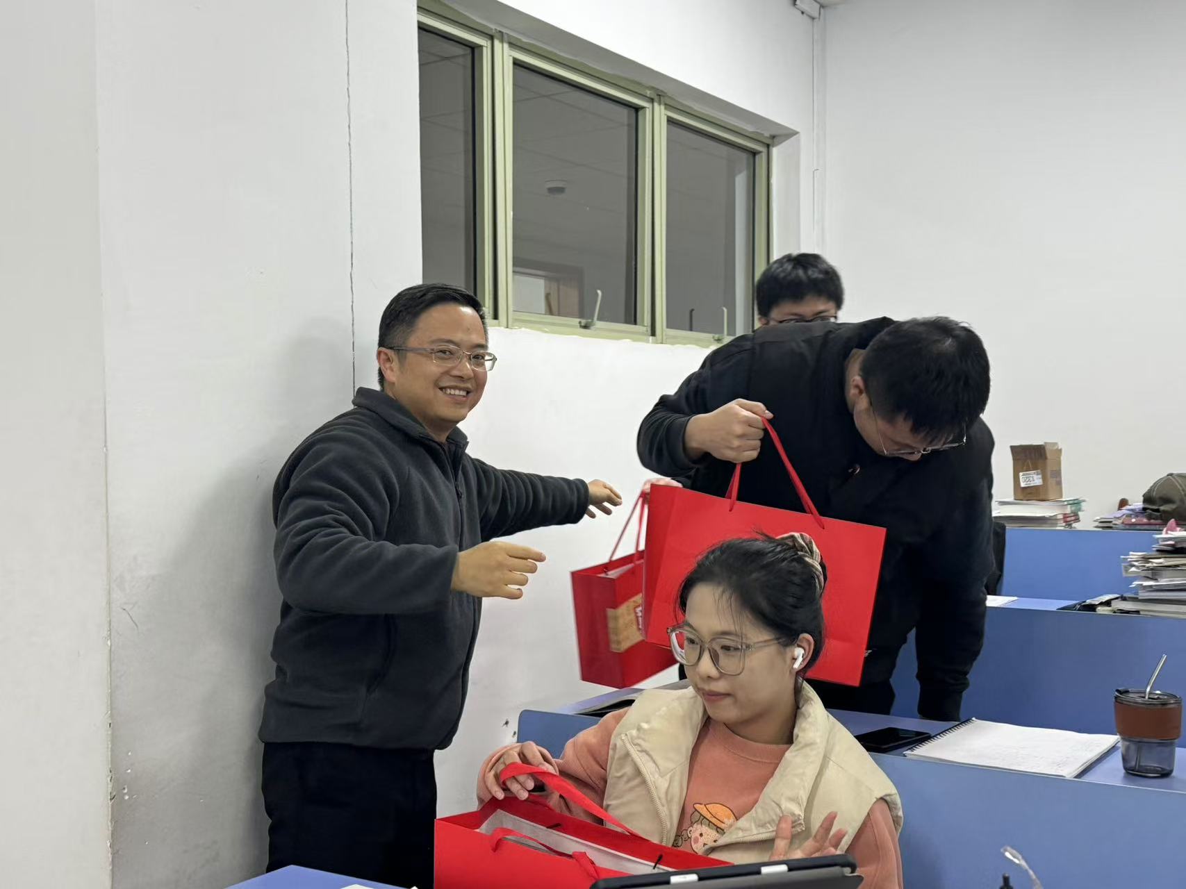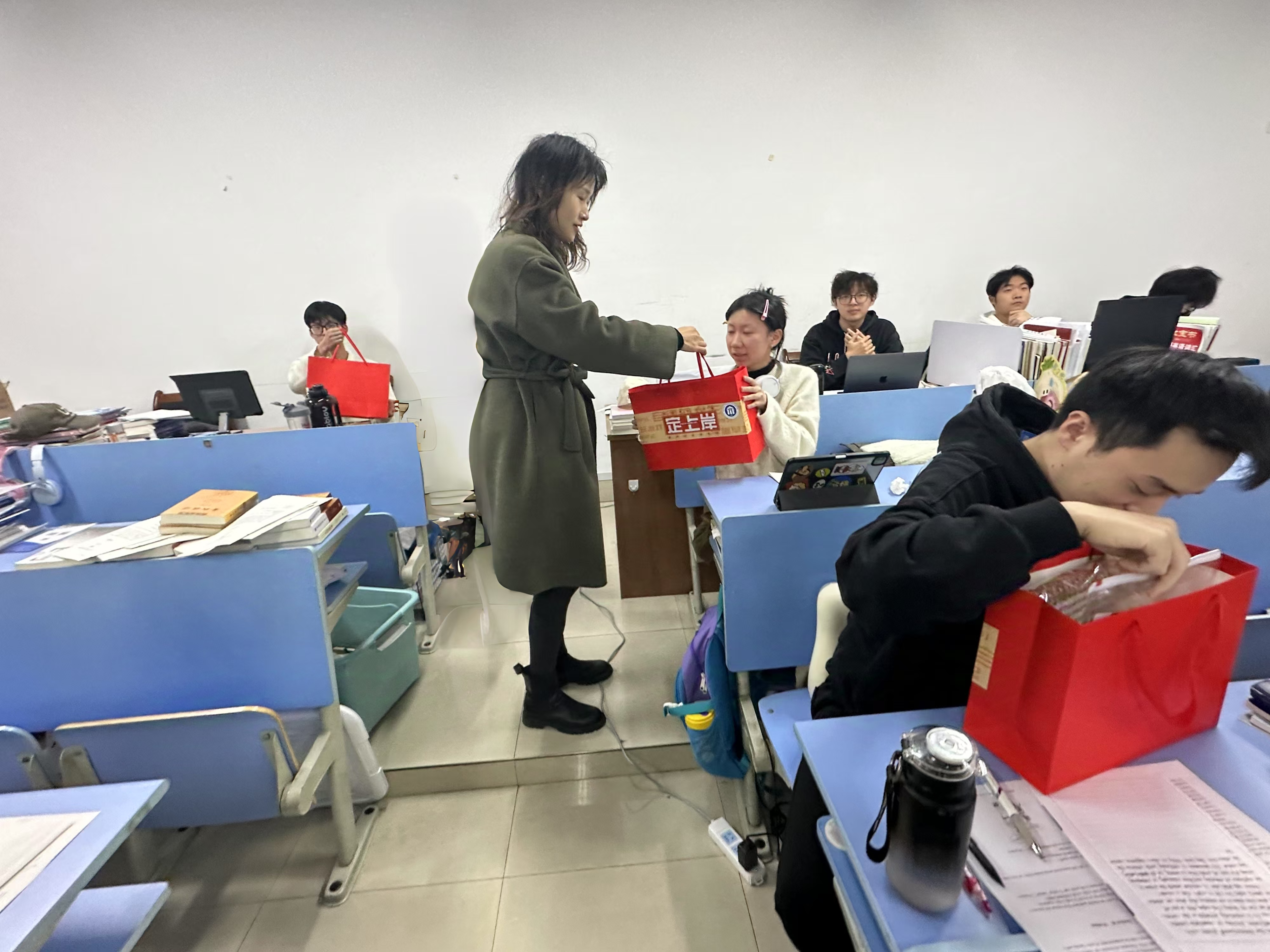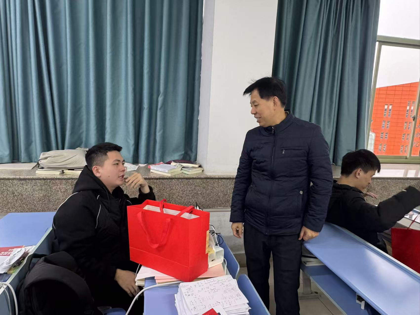 张帅院长鼓励同学们要坚定信心,保持良好的学习状态和心态,充分发挥自己的潜力,勇敢迎接考研挑战。同时叮嘱同学们在努力复习的同时,也要注意劳逸结合,合理安排作息时间,保持身体健康,以最佳的精神风貌迎接考试。老师们亲手将精心准备的慰问礼品发放到学生手中,这些礼品承载着学院对学生的殷切期望与深深祝福,让学生们在寒冬中感受到了浓浓的暖意。