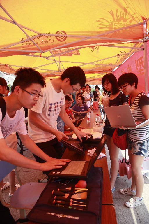 橘色的简易帐篷与夏季的炎炎烈日相互映衬。气温虽高,但带着自己的爱心涌入义诊场地来寻求帮助的同学却络绎不绝。未能把电脑带来的同学也纷纷在“上门服务登记处”详细登记,我们的工作人员会在3个工作日内进行上门服务。