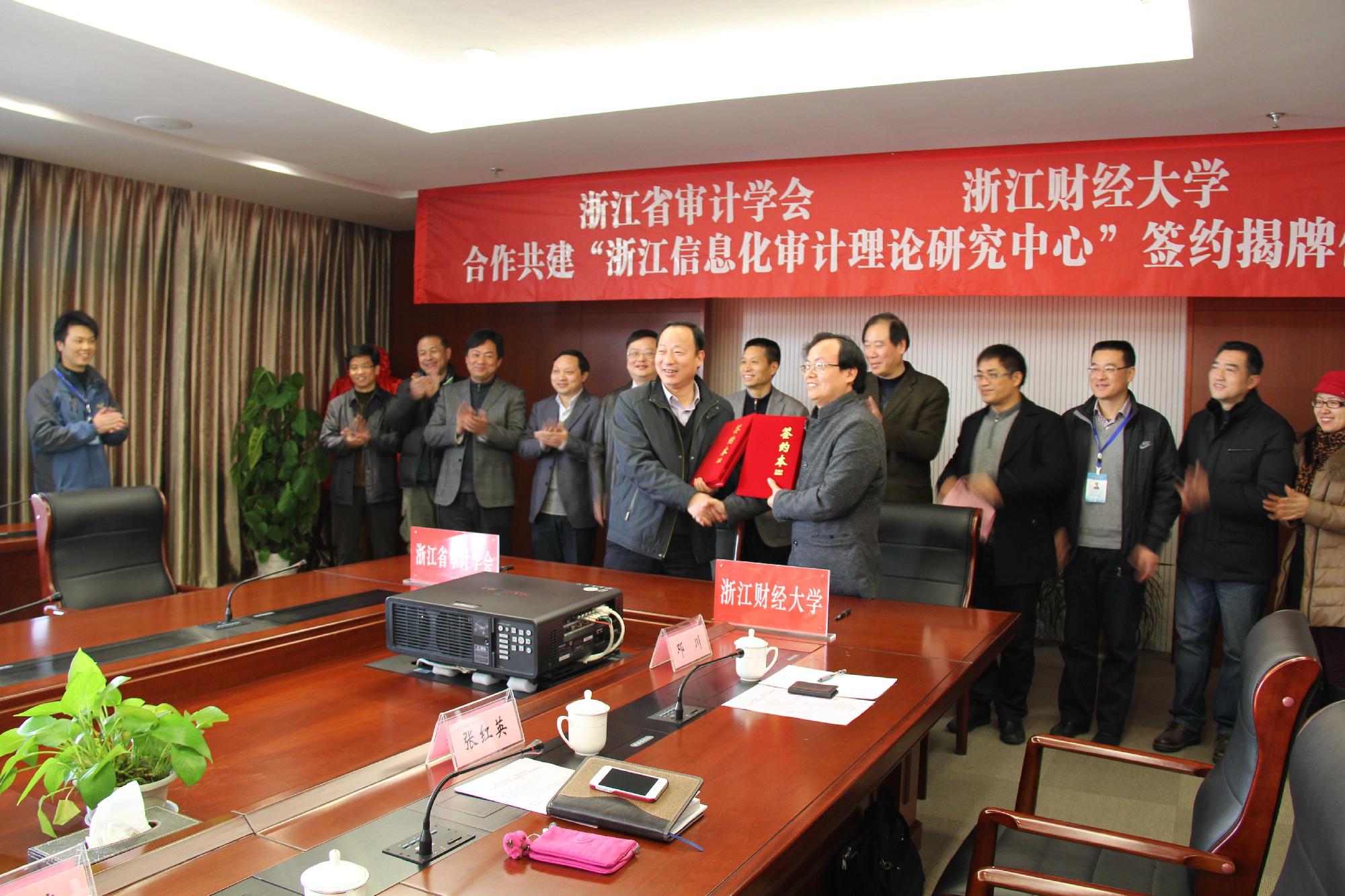 12月30日上午,“浙江信息化审计理论研究中心”签约暨揭牌仪式在我校行政楼会议室举行。浙江省审计厅副厅长王小龙、总审计师金建培、经济责任审计处三处处长姜英杰、审计中心主任周仲利、审计科研所所长甘伟军,校长王俊豪、副校长苏为华、副校长黄建新出席仪式,党校办、科研处、计财处、信息学院、会计学院的负责人和教师代表共计30余人参加仪式。