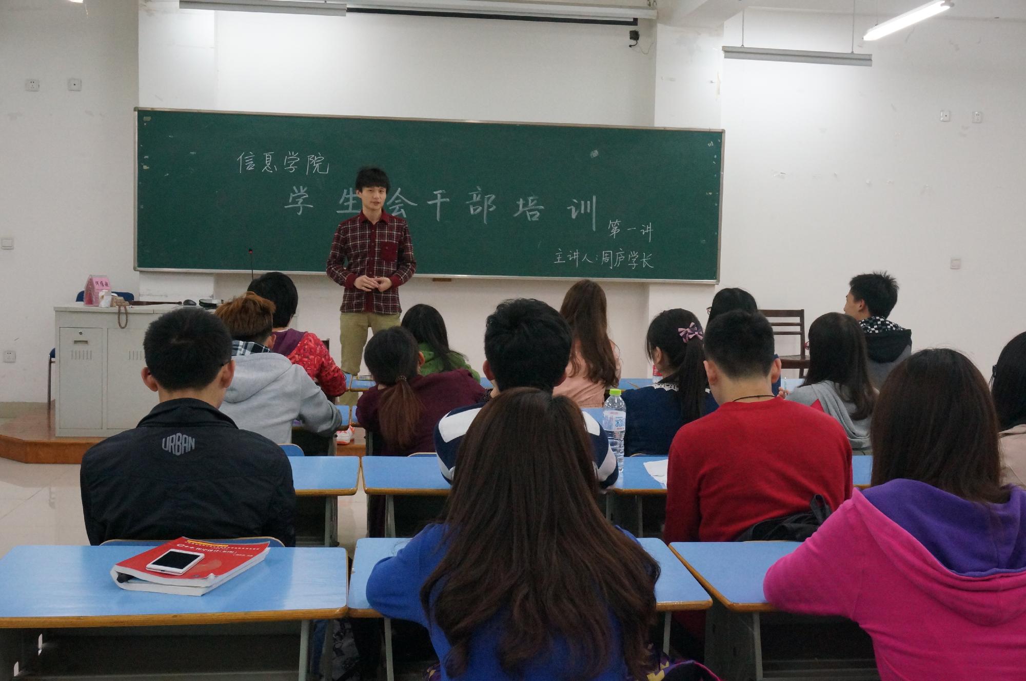 2014年4月27日星期日晚6点30分,信息学院楼9302开展了一场特别的活动——信息学院学生会干部培训第一讲。本次我们邀请到的是2010届曾任文艺部部长周庐学长来进行干事培训第一讲。