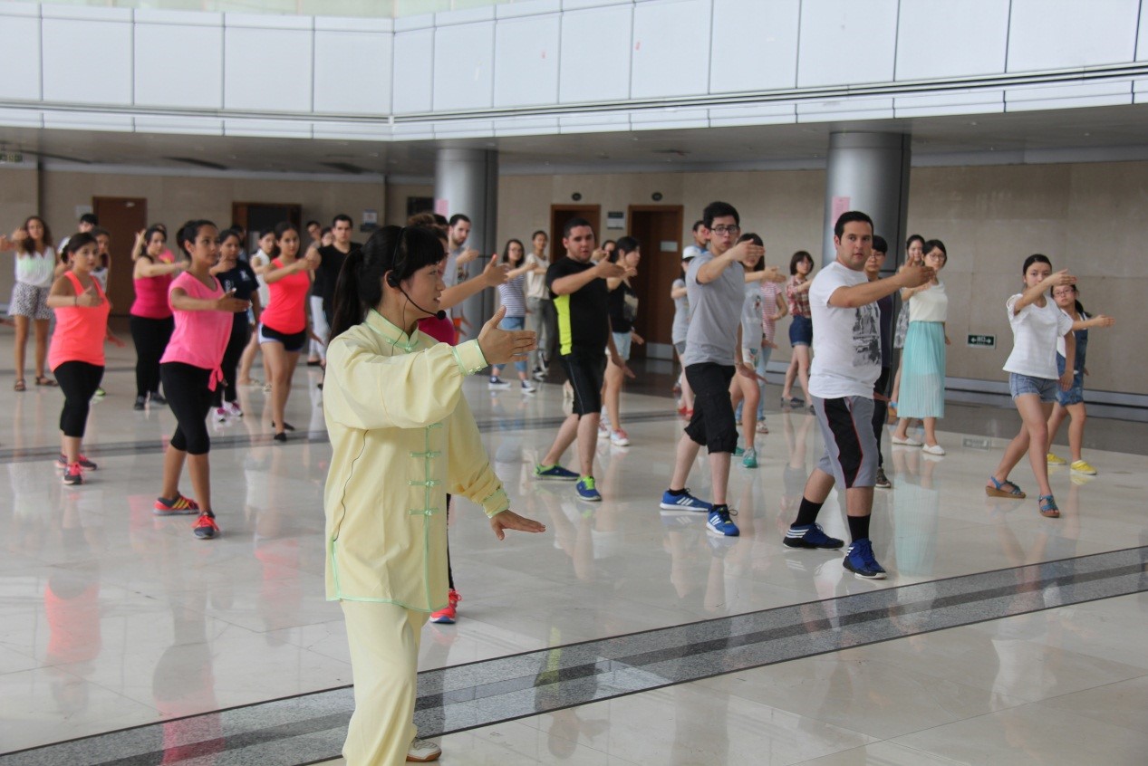 经过一上午的认真学习,为了丰富交流生的课余生活以及他们的精神压力,学校领导特意在午休后安排了这场既别出心裁又充满了中国文化底蕴的活动--学习简单的太极拳招式。H次元