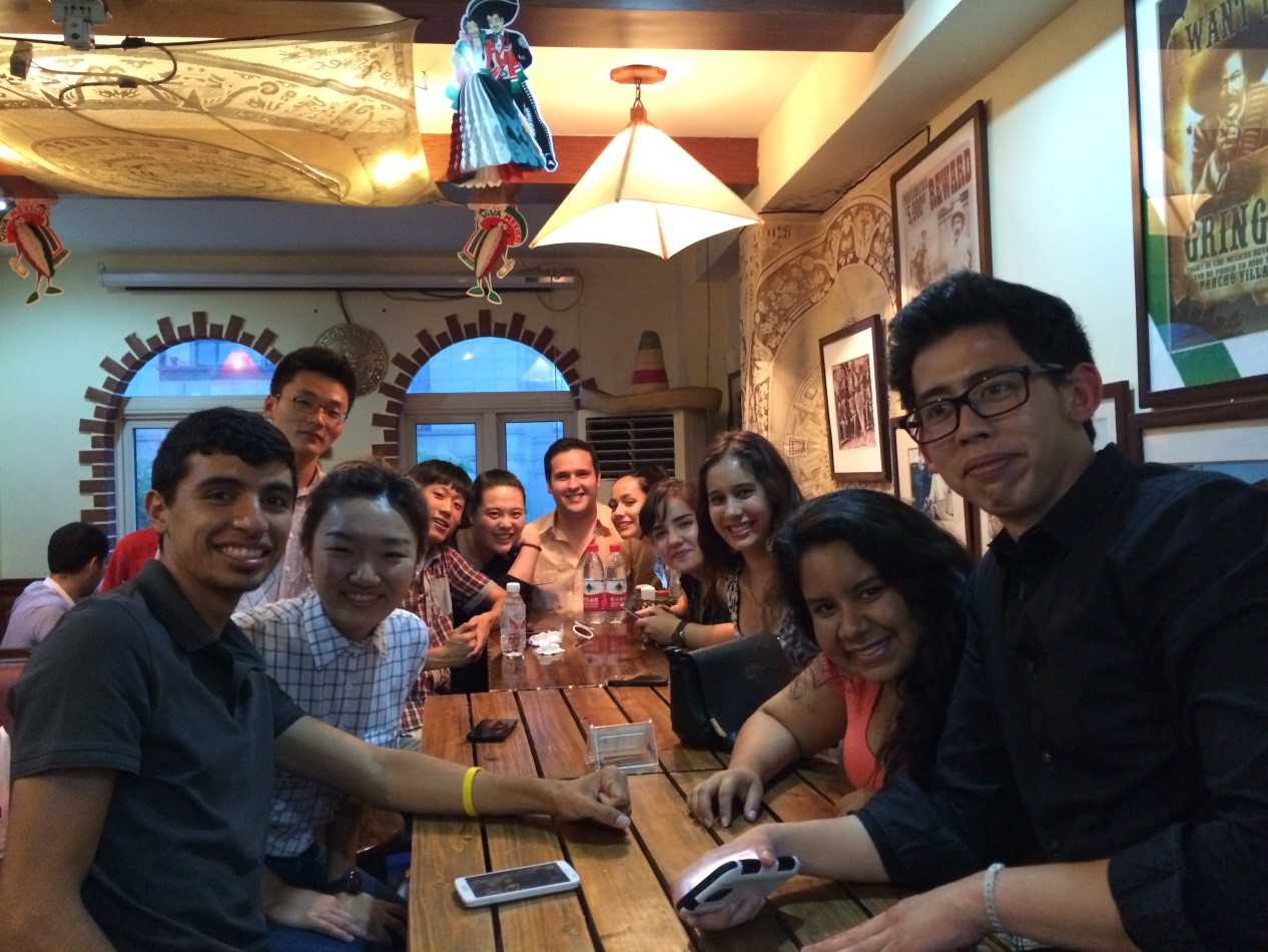 我们聊美食,并约好过几天去城西的墨西哥餐厅(后来经过亲身体验,我们表示很爱墨西哥的美食!),当然也会了解到我们对于对方国家之前的一些认知,经过交流才发现很多都是有偏差的,这种感觉真的没办法用言语形容,只能说认识他们真的很奇妙,我们还教美国学生跳时下最火的《小苹果》,真的太有意思了!