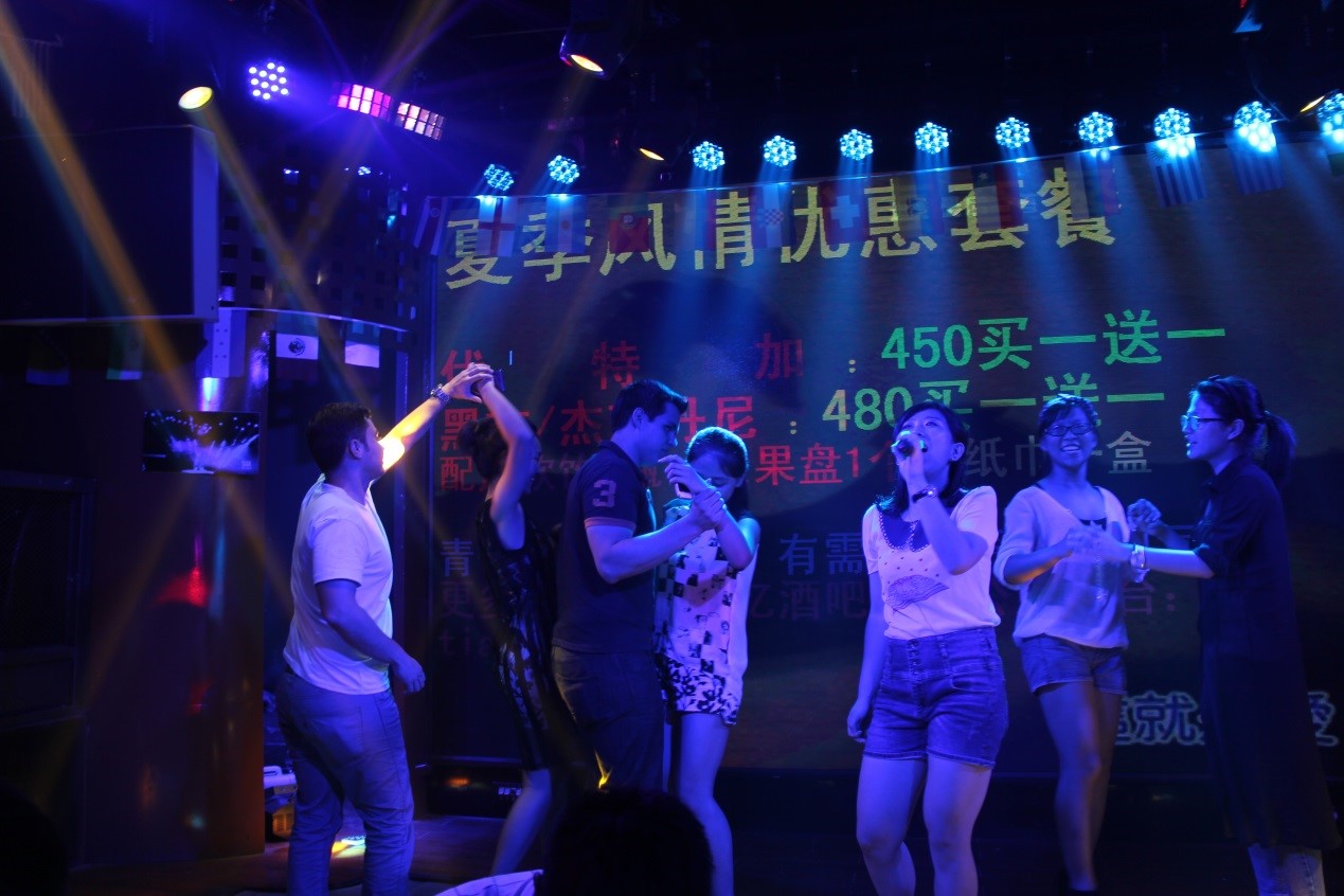 热情的美国人喜欢酒吧,我们就专门挑了一家下沙有名的酒吧——青忆酒吧。摇滚,啤酒,聊天成了这一晚的活动,酒吧老板的暖场欢迎更点燃了我们所有人的激情,为了表示对国际友人的友好,老板请我们唱歌,有人唱了中文歌,虽然外国同学不明白歌词意思,但是他们表示很喜欢这首歌的旋律和那时全场的气氛;Niya唱了英文歌,dianiala带大家在舞台一起在动感的音乐节奏下时快时慢的摇摆,所有的美国同学和中国同学都在舞台上High,此时没有国界,没有距离,每个人都充分感受文化的交融,在地球两端的两群人因为因为暑期班的机缘在高沙的这个小酒吧聚在一起,聊天、神侃,从父母兄弟到校园生活,从家乡风土到未来自己的打算。