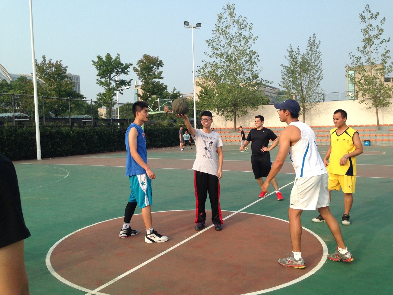 信息学院学生的联系和友谊,丰富美国来访交流生的业余生活,在浙财大信息学院领导的大力支持下,7月26日下午,两校学生的联谊会篮球友谊赛在浙财大篮球场上展开。