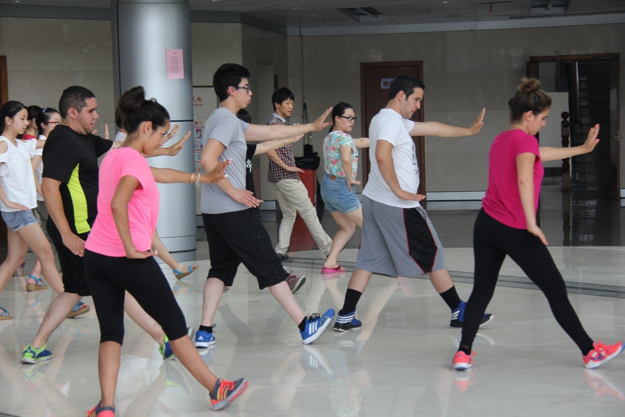 只见老师身着一袭黄衣,先演示了几个太极的基本动作及一套精心挑选的入门套路,美国学子在一旁认真地观看品味。老师在把连贯动作演示后,就把太极基本动作一一分解开来教他们练习,同时伴着详细的动作解释。一招一式,他们都学得有板有眼,颇有味道。学习的过程中,难免有难以理解或是不标准的动作,老师也会不时地停下来给予耐心的教导。基本动作习好后,便开始了那套连续动作的教学。外国学生也不辞辛苦的学习,足足过了一把中国功夫的瘾。让他们在感受民族特色的同时,也体验到了这种以柔克刚、以弱胜强的东方武术之道。