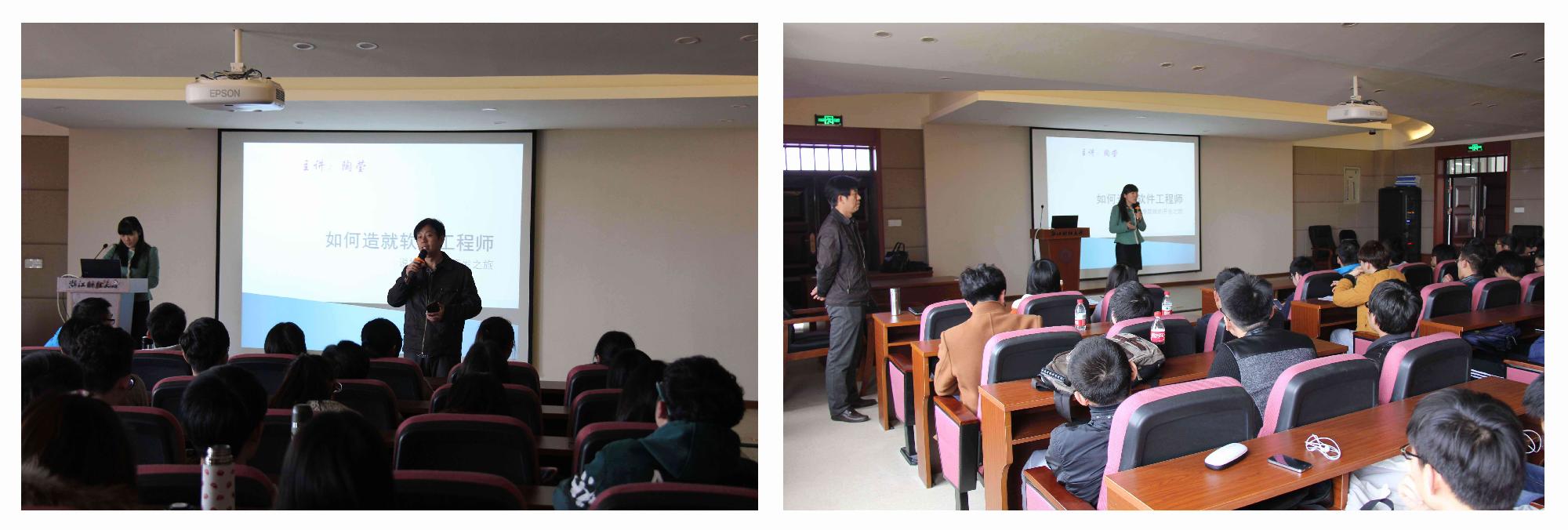 与校外实践基地的合作,深化实践教学改革,激发学生专业兴趣,15年3月23日下午杭州归谷实训基地技术经理陶莹老师应邀在信息学院302教室为同学们带来了一场神奇的软件开发之旅。副院长张帅教授主持并全程观摩了此次授课。