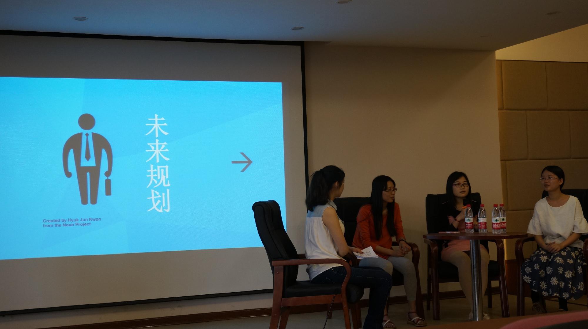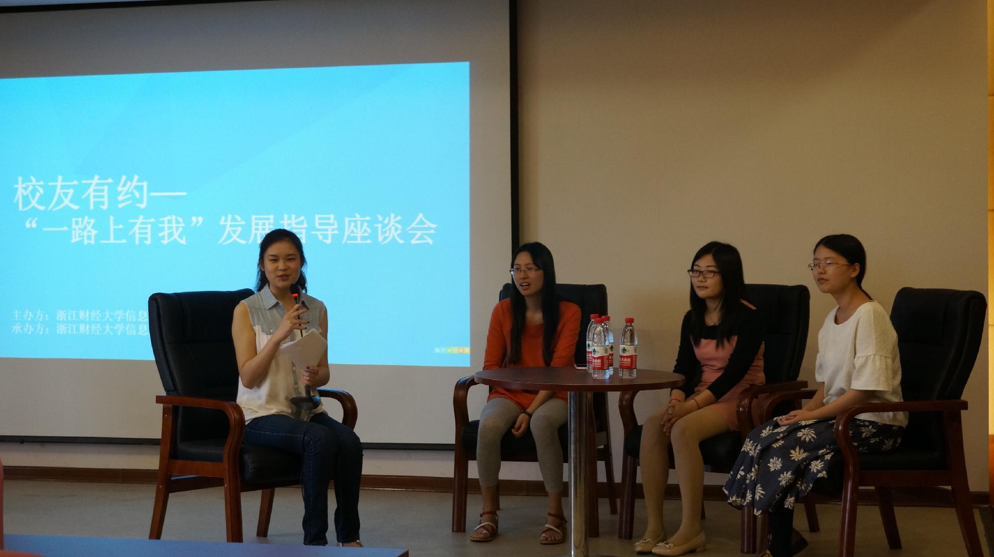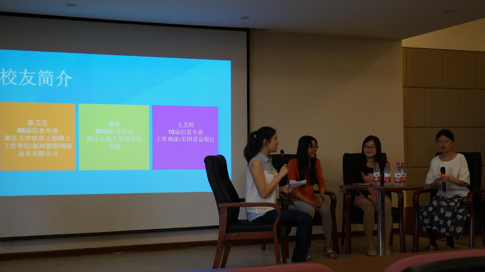 首先学姐们向在座同学简略地介绍了自己的个人经历,现就职于美国道富银行的毛芳婷学姐颇有感触得说到,一份好的简历真的非常重要,正是她当初那份简历的与众不同,她才得到了现在这份工作的面试机会,除此以外,她大学时在数学建模上得到的经历也得到了她上司的赏识。另外,学姐还提到了第二专业的问题,第二专业使她成为了一个更受企业赏识的综合性人才。随后,当主持人问道以后找工作专业不对口时我们应该如何做时,现就职于杭州煎饼网络技术有限公司的陈芸芸学姐给出了她的建议,这位学姐有着丰富的工作经验,她认为从事IT行业的不一定需要掌握各种算法,现在互联网最重要的是获取用户量,互联网营销等等都是一份很好的工作,所以并不用太担心专业不对口的问题。紧接着,现浙江工业大学研究生在读的陈琼学姐同学们探讨起了关于考研和就业的问题,在她看来,如果选择考研,就一定要早定下目标,也要明确自己未来发展的方向是从商,从政或者学术研究。而创业则需要富有创新性思维,敏锐的洞察力等等及永不言败的自信。