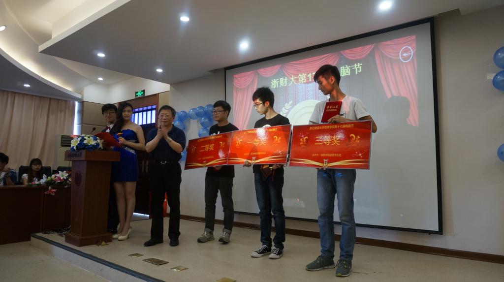 首先由配音大赛一等奖获得者现场配音《冰雪奇缘》。灵动的声音切实还原了电影人物,带动了现场的气氛。紧接着对本届电脑节系列活动中获得奖项的同学进行现场表彰。随后是优秀成果现场展示,分别有浙江省第十四届“挑战杯”中取得优异成绩的亮点团队和聚信息团队以及“其乐”校园团队主创吴姚迪学长进行分享。活动的最后以一段优秀选手采访视频作为本届电脑节的一个圆满结点。