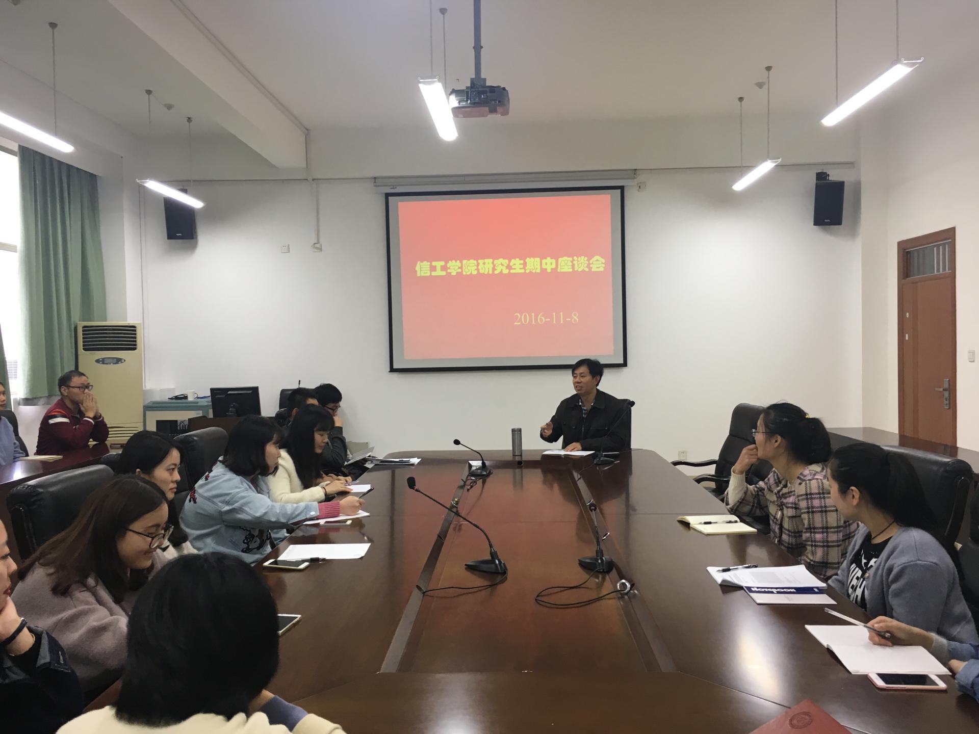 在学院404会议室举行了2016-2017学年第一学期研究生期中座谈会。学院副院长张帅老师、研究生辅导员及学院二十余名研究生参加了此次座谈会。座谈会上,张帅老师首先询问了在座研究生的学习、生活以及论文进展情况,并对大家的学习以及论文发表寄予厚望,希望研究生能充分利用好课余时间,多阅读文献,特别是英文文献,争取早日发表质量较高的论文。随后张帅老师对研究生关于论文研究方向、课程设置、奖学金评定规则等方面的问题做了详细解答。通过这次期中座谈会,学院进一步了解了学生的学习和生活进展,研究生也进一步明确了自己今后的努力方向。