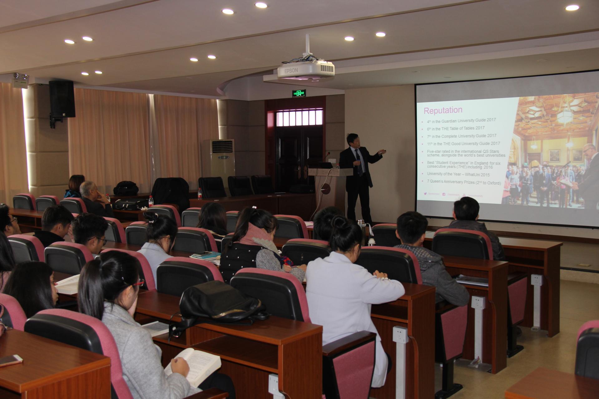下午1:30在9-302报告厅,拉夫堡大学数字技术学院Ahmet Kondoz院长和Xiyu Shi副研究员作为主讲人,介绍了拉夫堡大学数字技术学院的研究生专业情况和4+1合作项目申请条件。两位教授用风趣幽默的语言,结合精美的PPT演示,给大家深入浅出的介绍了拉夫堡大学概况及留学要求。在宣讲会问答环节,同学们纷纷就自己关心的问题举手提问,很多同学表现出对英国留学的浓厚兴趣。