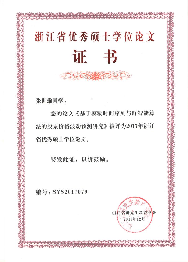 管理统计学专业2014级硕士毕业生张世雄的硕士学位论文《基于模糊时间序列与群智能算法的股票价格波动预测研究》被评为2017年浙江省优秀硕士学位论文。此次评选共评出21篇优秀博士学位论文,94篇优秀硕士学位论文,我校共有3篇硕士学位论文入选。这是继2016年H次元