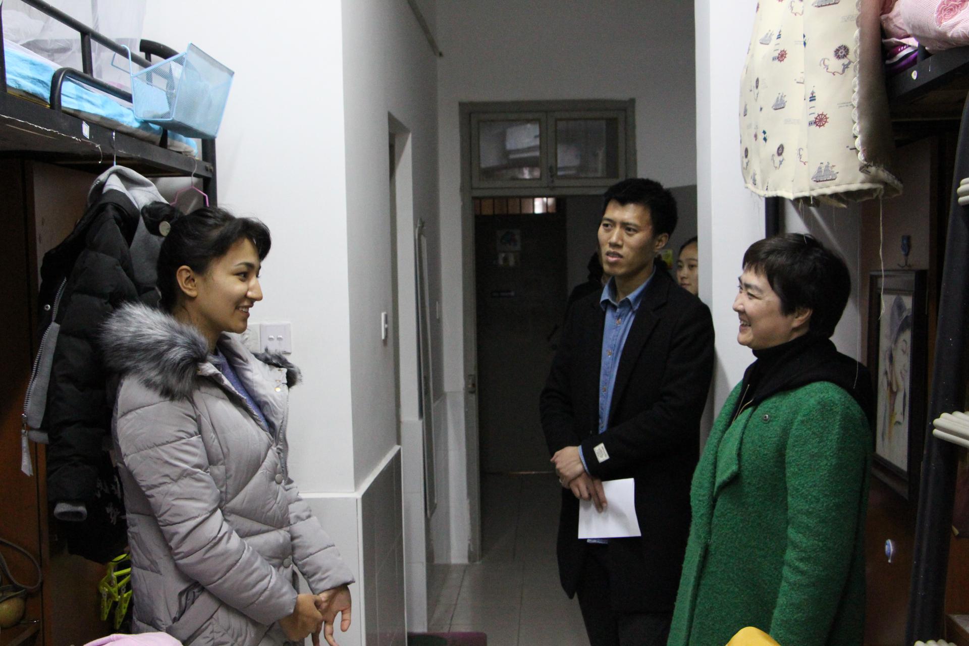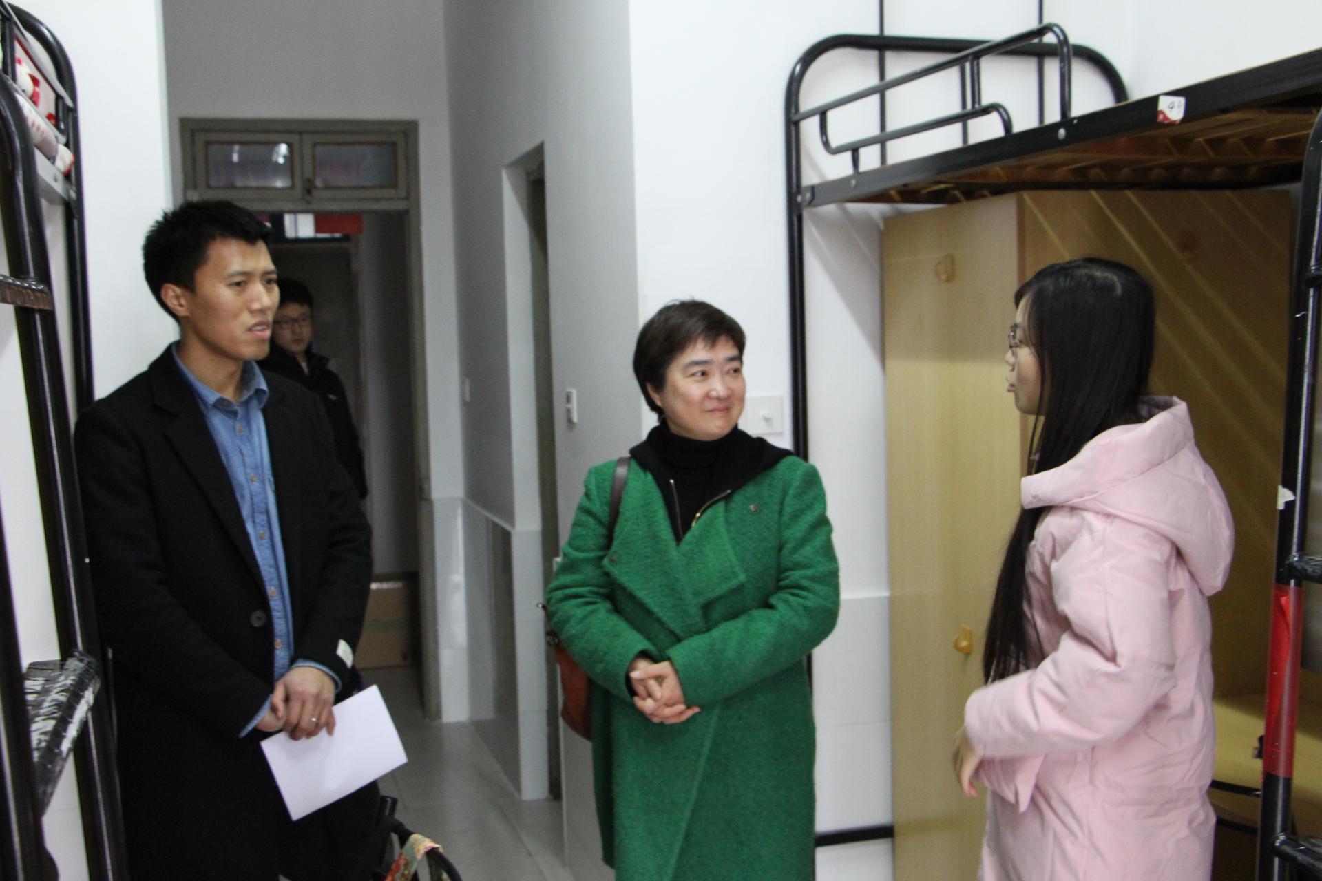 在寝室中,冯睿书记与同学进行了亲切的交谈,询问了同学们的学习情况和生活情况,探讨了课程学习上的问题,询问了毕业班的同学的就业打算,建议同学们积极争取机会多实习、多积累工作经验,提醒同学们天气变化多注意身体,元旦回家路上注意安全。