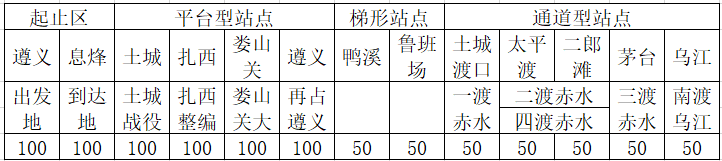 比赛得分:比赛出发地为“遵义”,目的地为“息烽”,沿途有土城、扎西、娄山关、遵义和息烽等6个平台型站点,鸭溪和鲁班场2个梯形站点,土城渡口、太平渡渡口、二郎滩渡口和茅台渡口等4个通道型站点,每个平台型站点得分100分,梯形站点50分,通道型站点50分。