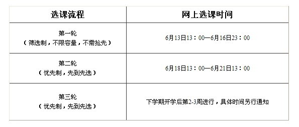 1、修读课程(含重修、补修)实行网上选课。第一轮采用筛选制,第二、第三轮采用优先制规则。