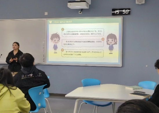 接着,史老师进一步地阐释了“什么是心理委员”。老师指出,心理委员是学校心理健康系统中的重要一份子,是沟通班级同学和学校心理健康工作组的桥梁,要当好“传达者”、“支持者”、“排雷兵”,向本班学生宣传心理健康知识,主动关心同学并与他们保持良好的人际关系,及时了解班级同学的心理健康状况及需求,向心理老师或辅导员反馈,同时牢记自己的工作原则,更好引导同学们走出心理阴霾,逐步养成乐观、积极、开朗的心理状态。