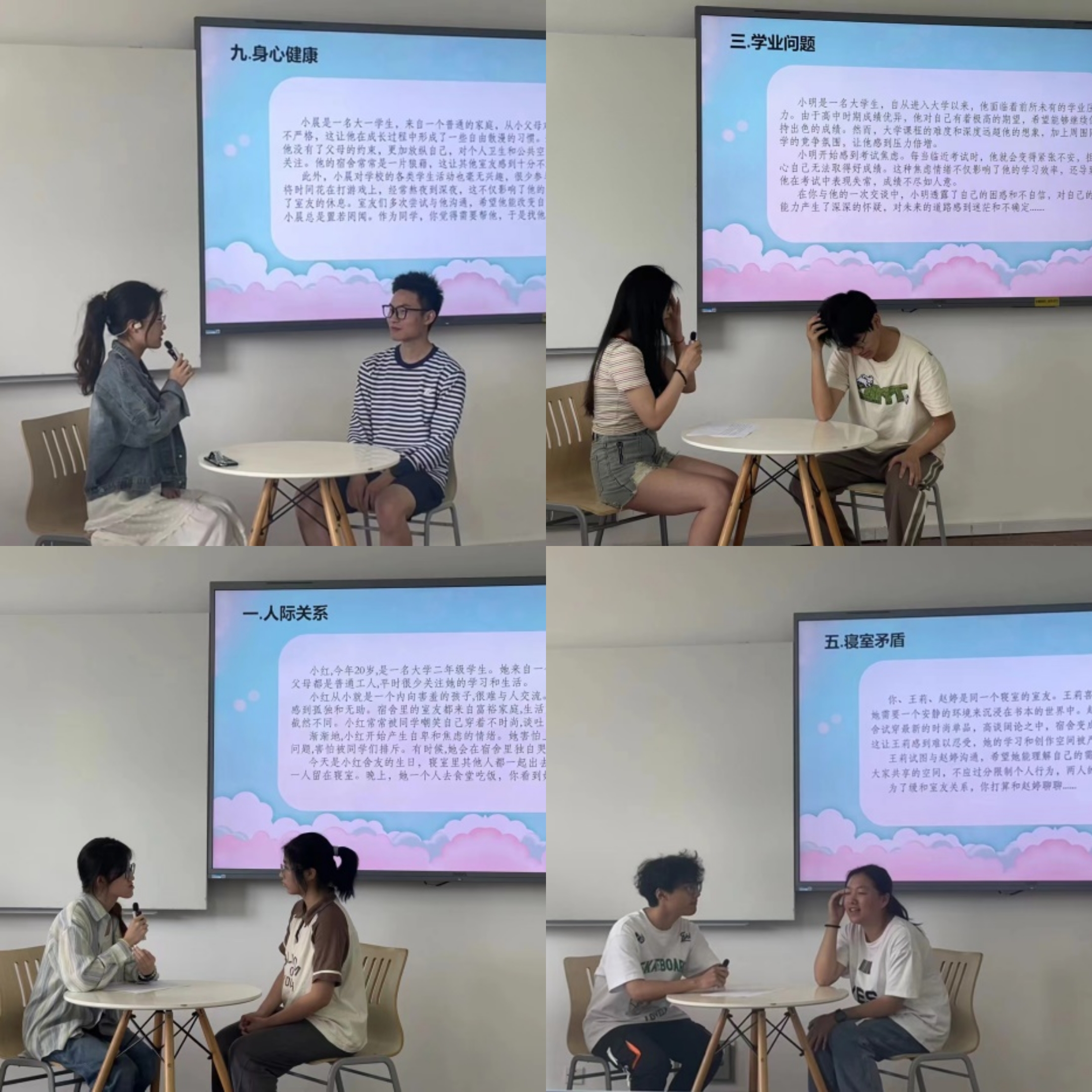 比赛中,选手们和演员们以精湛的演技和生动的剧情,展示了当代大学生容易遇到的各种心理问题。无论是寝室关系的紧张、亲子朋友的关系,还是考前焦虑的困扰、个人内心的整合,他们都一一呈现。选手们以被辅导人室友、班委、多年好友等朋辈身份,在用智慧与关怀为对方进行开导、安慰和支持的过程中,感受每一个角色的情感波动,真情实感也触动了评委和观众的心灵,不仅让观众们更深入地了解这些心理问题,也引发了同学们对自我成长的思考。
