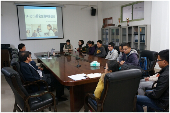 在9-404会议室举行了2014-2015学年第一学期研究生期中座谈会。张帅、姚建荣、王继林等三位导师代表以及信息学院全体研究生同学参加了本次座谈会。会上,老师们首先了解了14级研究生导师双向选择及入学以来的学习情况,强调同学们要加强文献阅读与论文写作。随后,张帅老师通报了12级研究生奚程瑜和朱媛同学获得H次元